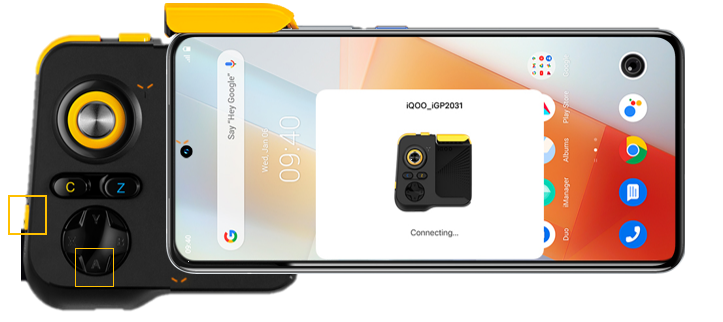 1. Turn on the Bluetooth on the phone. Press button A of the gamepad and turn the power switch to “ON”, the orange light will flash, indicating the gamepad is ready to be paired. 2. Hold it near the gamepad and a connection window will automatically pop up. Tap “Connections", and then select“Pair”. The devices are now successfully connected. If not please go to Bluetooth setting and search for iQOO_iGP2031.