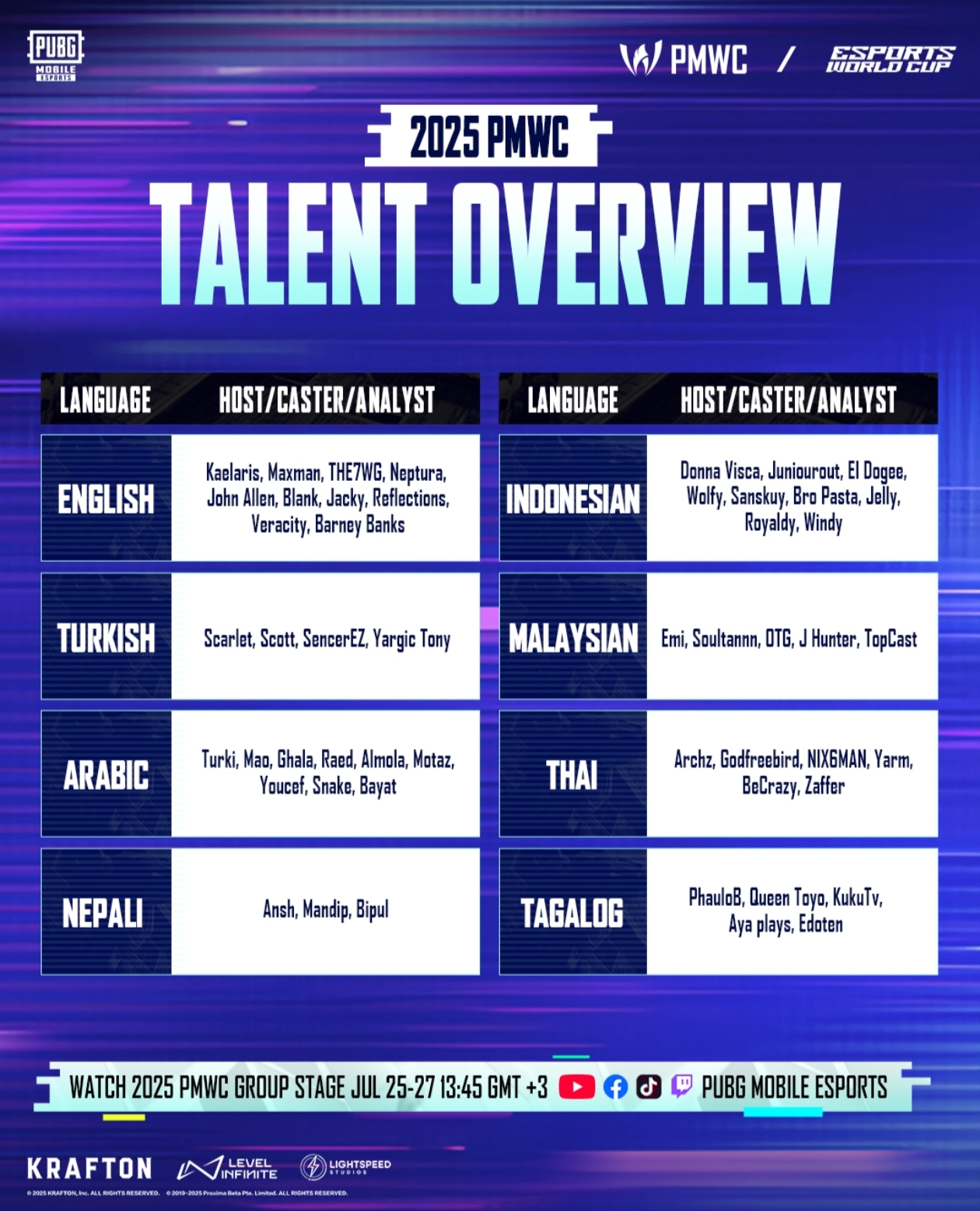 Get ready for the 2025 PUBG Mobile World Cup, where the action is not just in-game, but also brought to you by an incredible lineup of Hosts, Casters, and Analysts from around the globe!