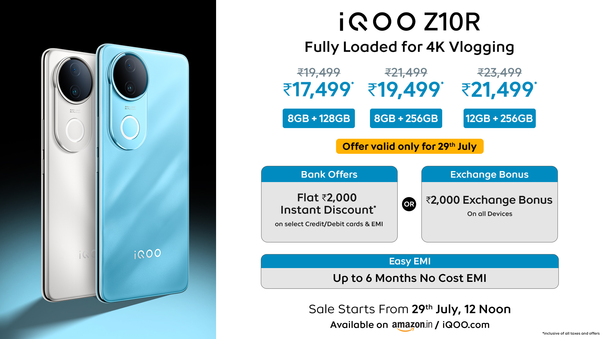 The iQOO Z10R is priced at INR 19,499 (Net Effective Price: INR 17,499) for the 8GB + 128GB variant; INR 21,499 (Net Effective Price: INR 19,499) for the 8GB + 256GB variant and INR 23,499 (Net Effective Price: INR 21,499) for the 12GB + 256GB variant.