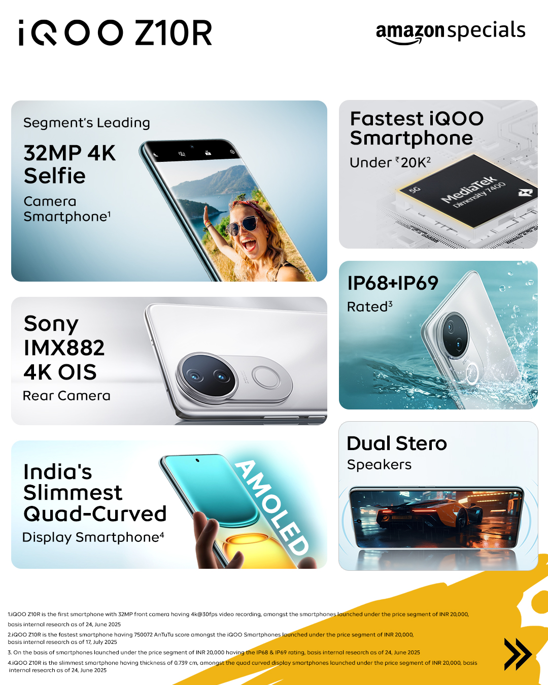 Tanmay Shah, Category Leader – Smartphones, Accessories and Post Purchase Services said,“We are thrilled to bring the iQOO Z10R to Amazon.in, reinforcing our commitment to offering one of the widest selections of innovative smartphones with unmatched convenience and accessibility. The iQOO Z10R's impressive 4K selfie camera, 120Hz AMOLED display, and powerhouse AI features will surely excite customers. On Amazon.in, customers nationwide can easily discover this device with detailed product information, genuine reviews, and reliable delivery to their doorstep. Our seamless shopping experience with exciting launch offers and comprehensive support ensures that aspiring creators and tech enthusiasts can access professional-grade content creation tools without any barriers, making innovation available to creative minds across the country starting July 29th.”