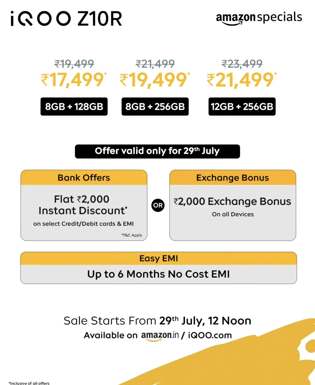 Coming to the price, the net effective price for the 8GB + 128GB model is ₹17,499, while the original price is ₹19,499. You can apply an instant bank discount, which brings the price down by ₹2,000. The 8GB + 256GB model costs ₹21,499, with a net effective price of ₹19,499.As for the top-end 12GB + 256GB model, it is priced at ₹23,499 and can be brought down to ₹21,499. There is also a 6-month no-cost EMI option, and you can avail an instant discount of ₹2,000 using HDFC or Axis Bank credit cards. Alternatively, you can also get a ₹2,000 exchange bonus. The sale for the iQOO Z10R starts on 29th July at 12pm.