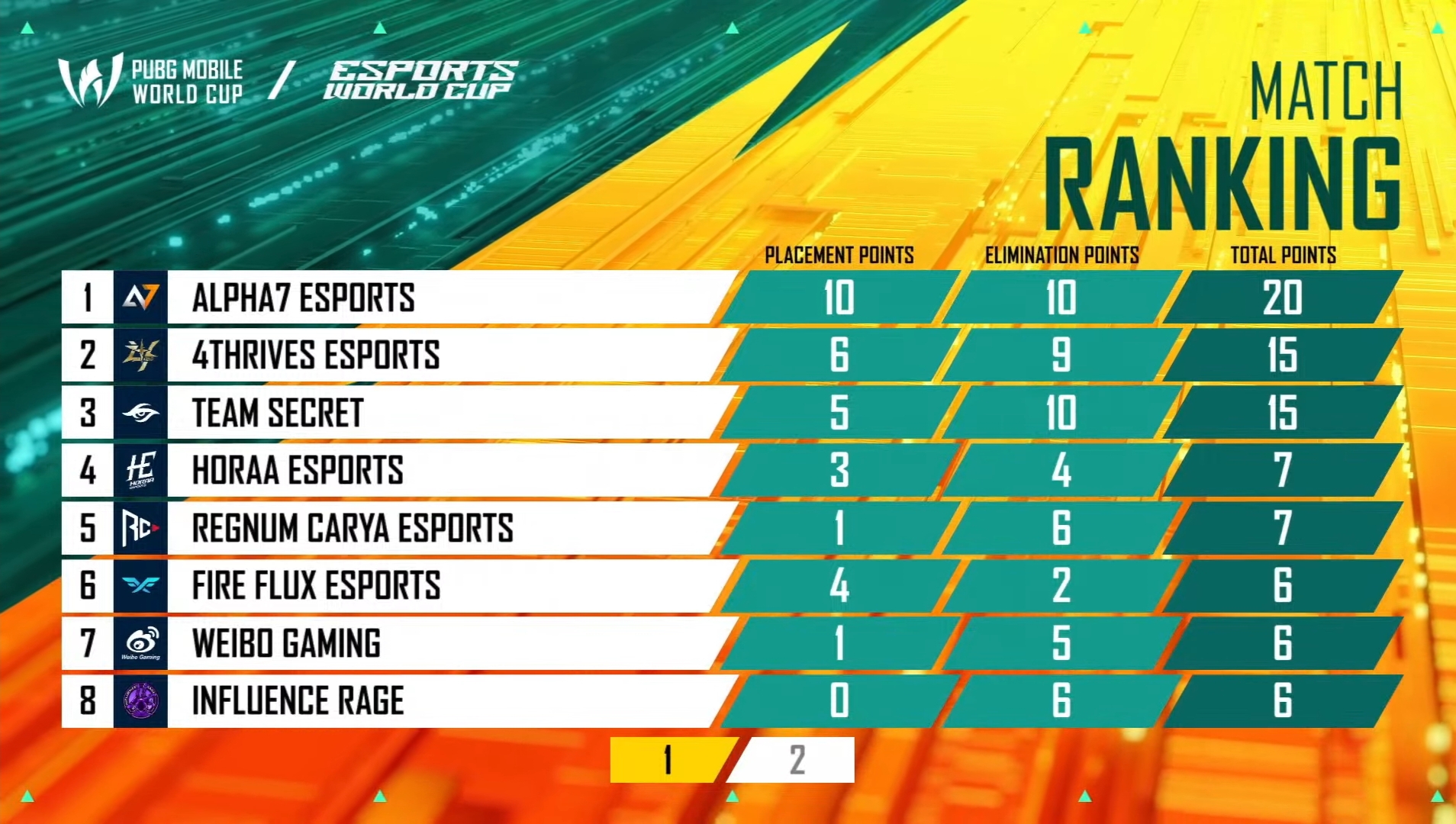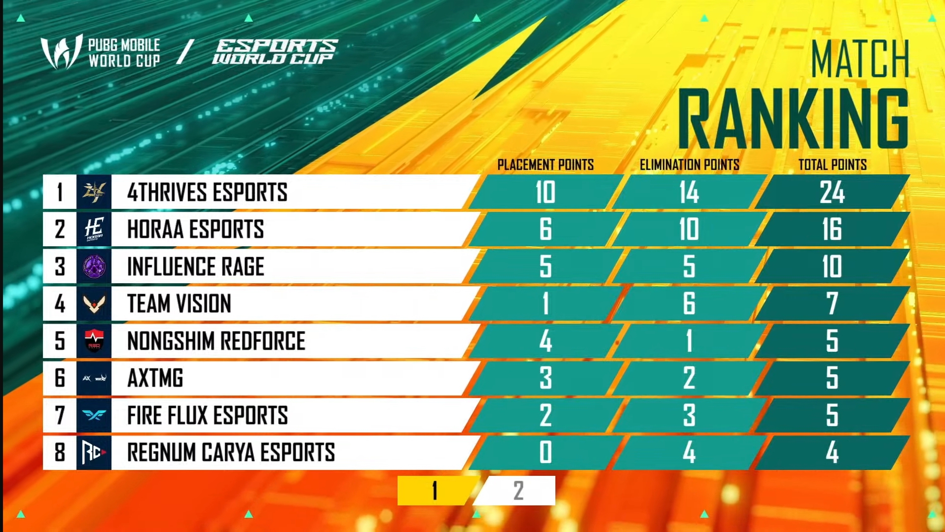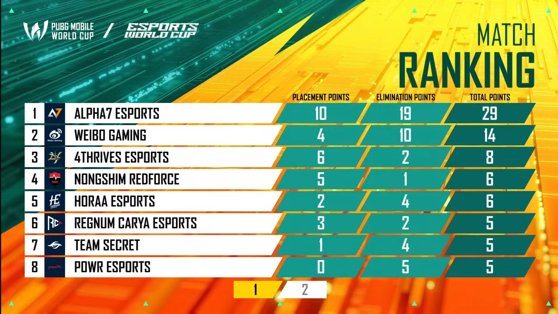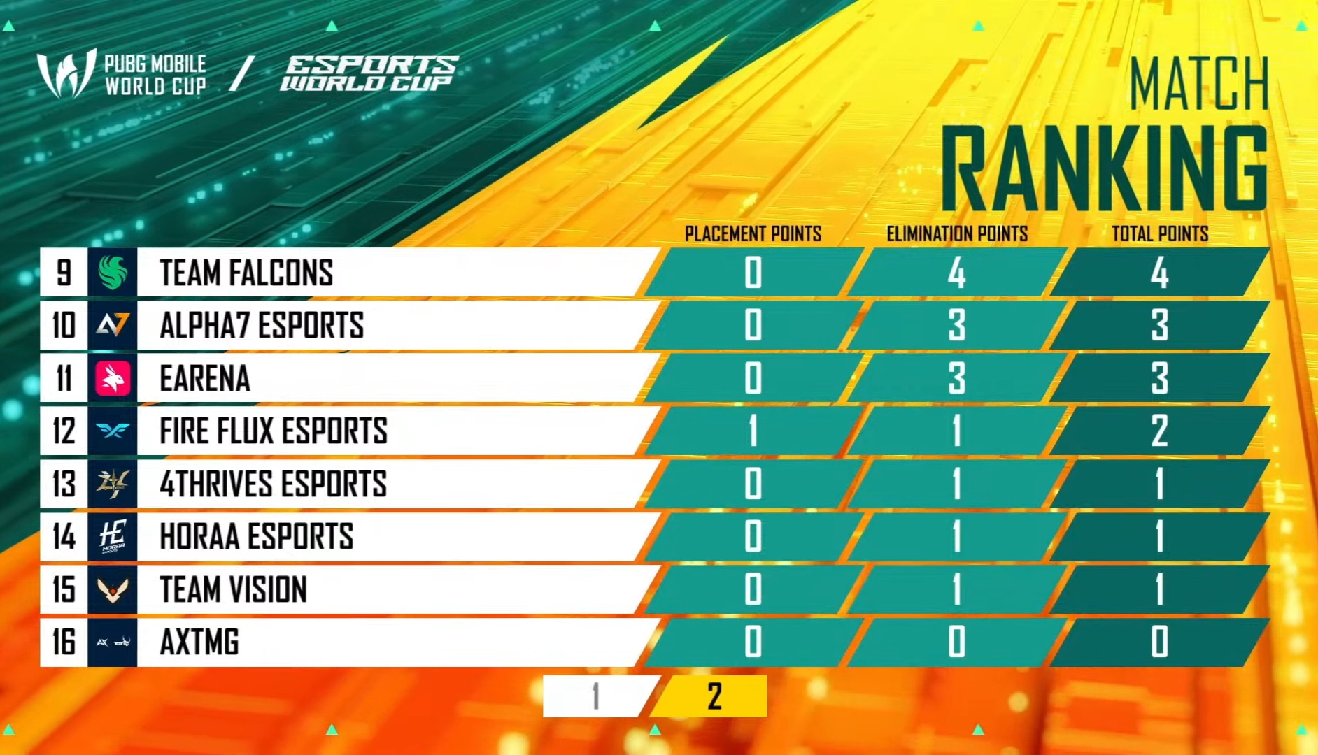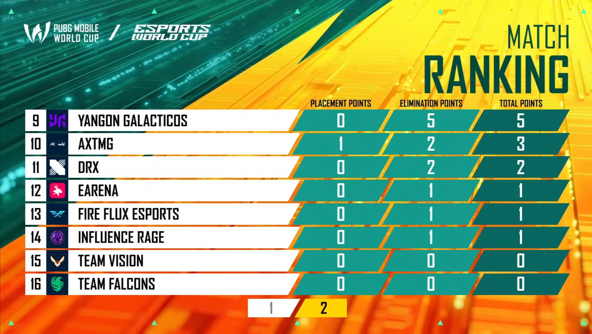 Team AxTMG from India had a mediocre start to the PMWC, as they finished 11th with 22 points after six matches. Team Falcons was 12th with 22 points. EArena and NongShim were in the bottom two with 18 and 16 points, respectively.