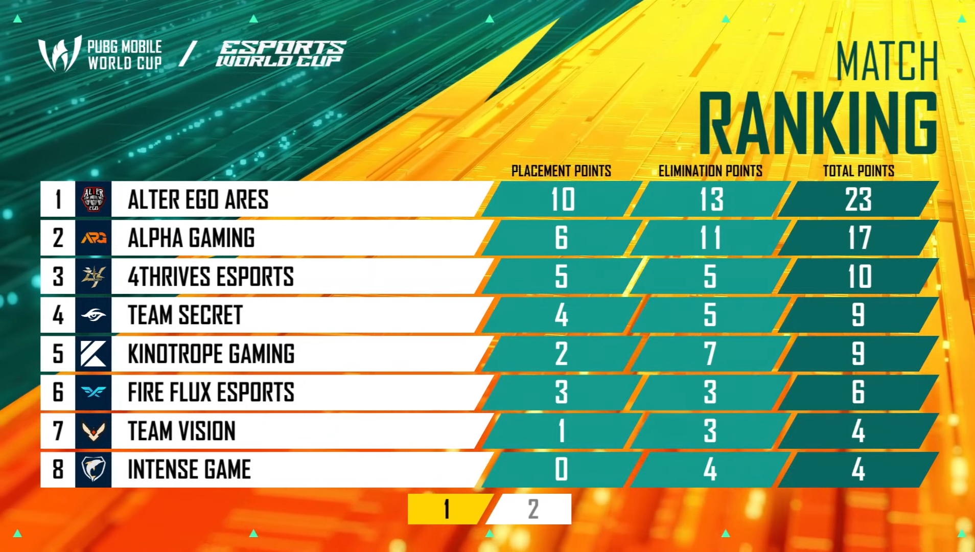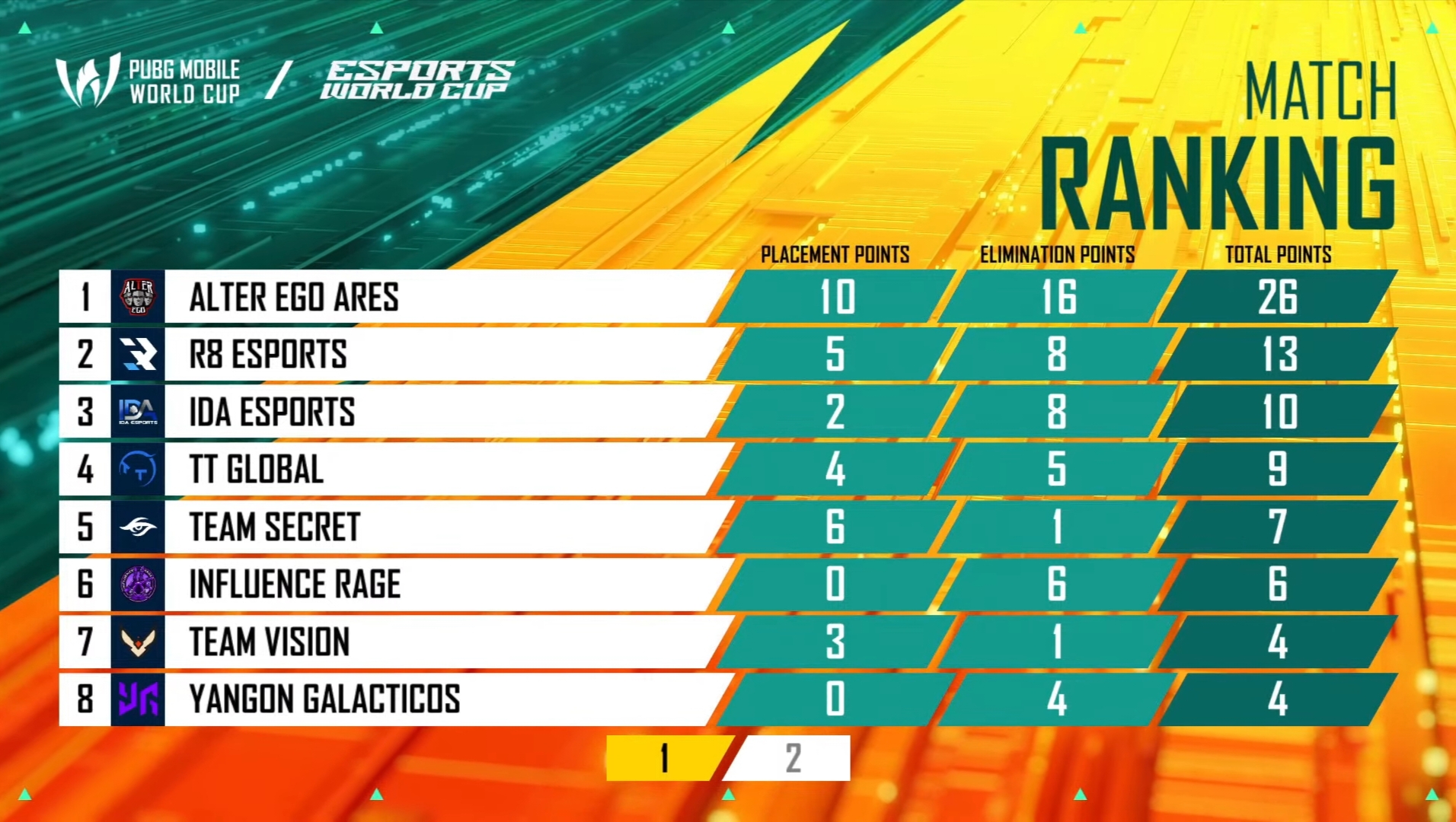 Alter Ego maintained their rhythm and won their consecutive second Chicken Dinner with 26 points. R8 Esports and IDA scored 13 and 10 points, respectively. ThunderTalk earned nine points.