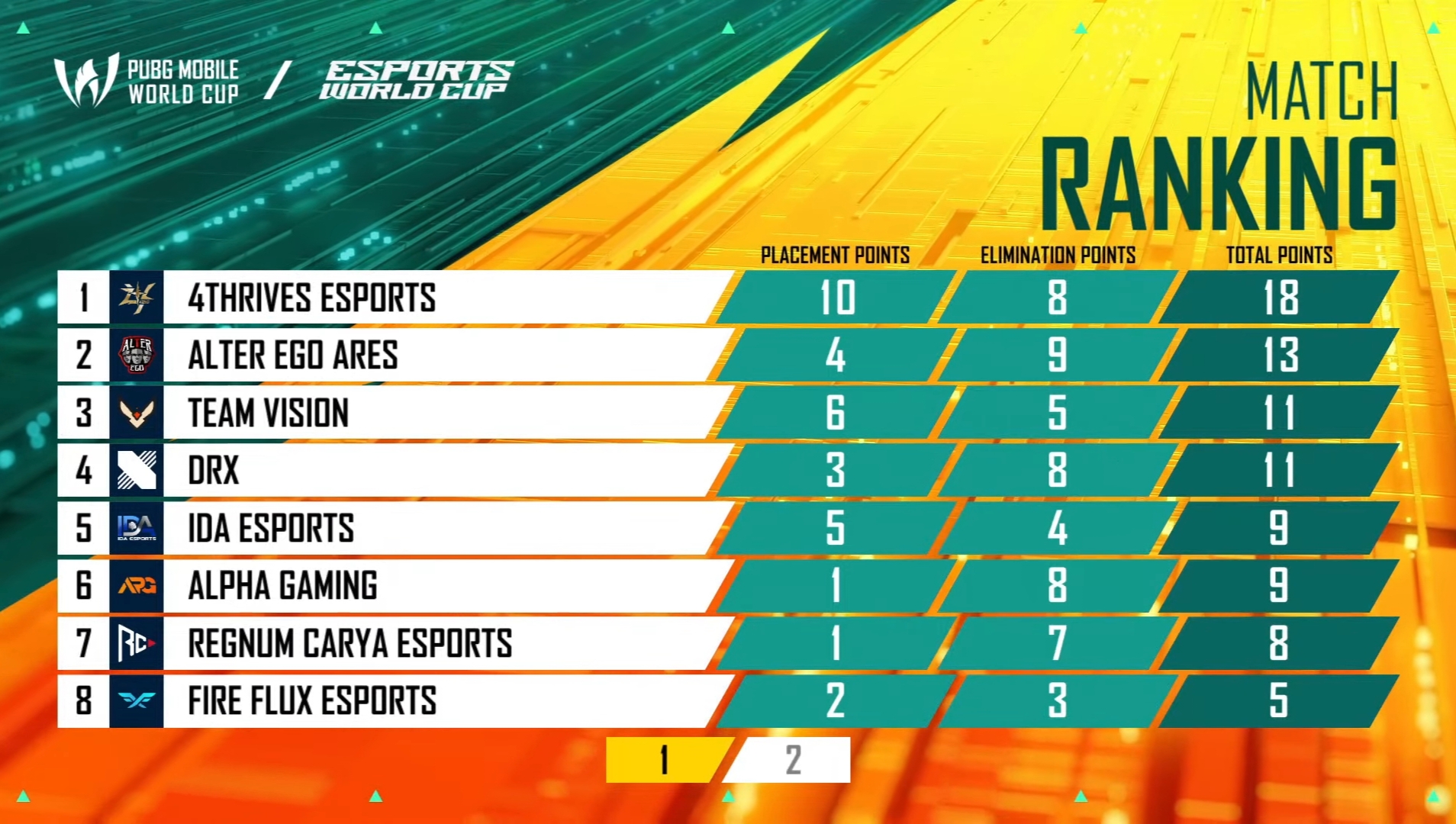 4Thrives continued their brilliant run in the game and won an 18-point Chicken Dinner. Alter Ego accumulated 13 points. Vision and DRX scored 11 points each. IDA and Alpha Gaming grabbed nine points each.