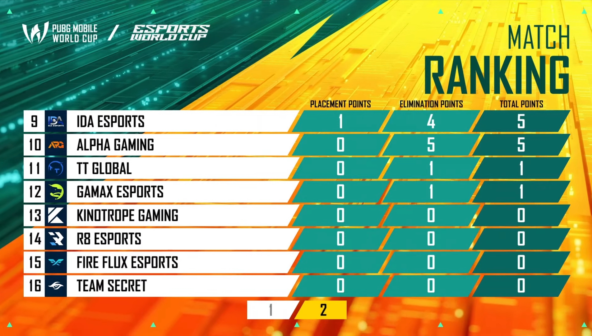 ThunderTalk from China displayed outstanding performances and secured their first Chicken Dinner of the PMWC with 26 points. Team Secret, Influence Rage, Regnum Carya, and IDA took nine points each.