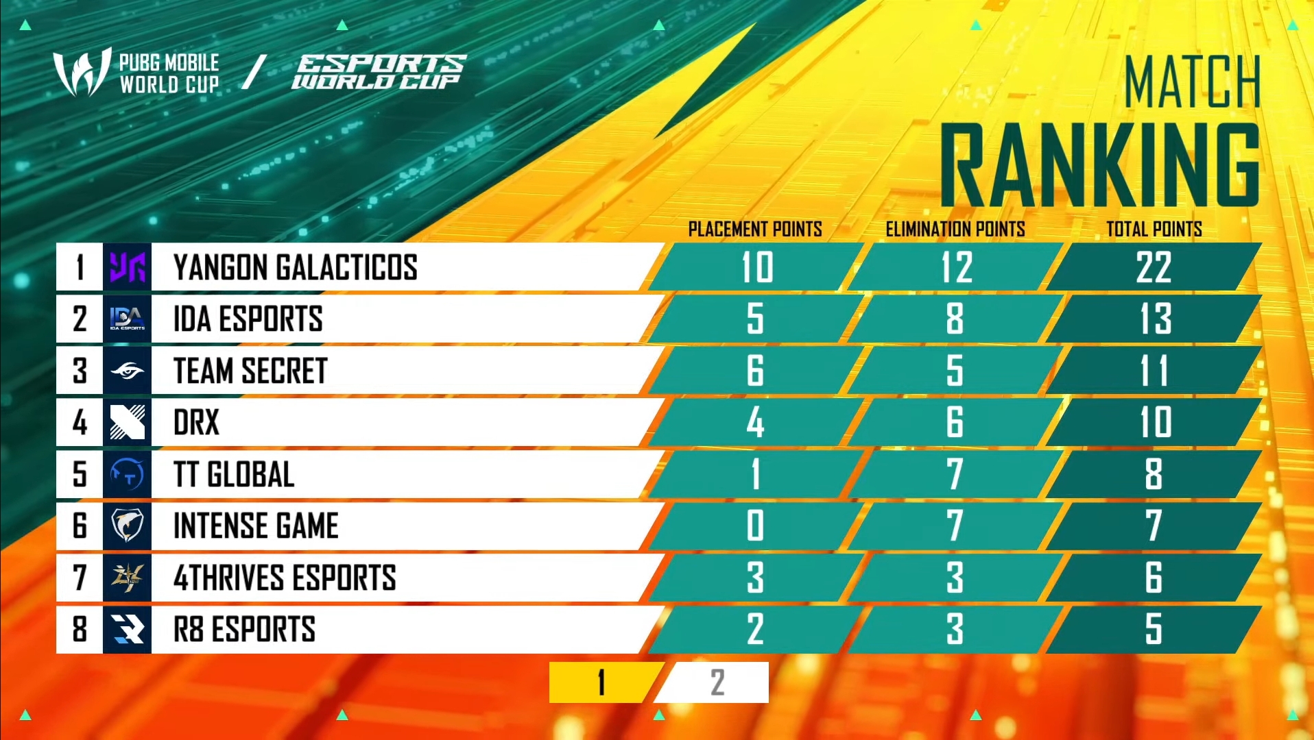 Yangon Galacticos emerged victorious in the last game of Day 2 with 22 points. IDA collected 13 crucial points. Teams Secret also had a fantastic run as the Vietnamese squad scored 11 points. DRX earned 10 points in their last match of the PMWC Group Stage.