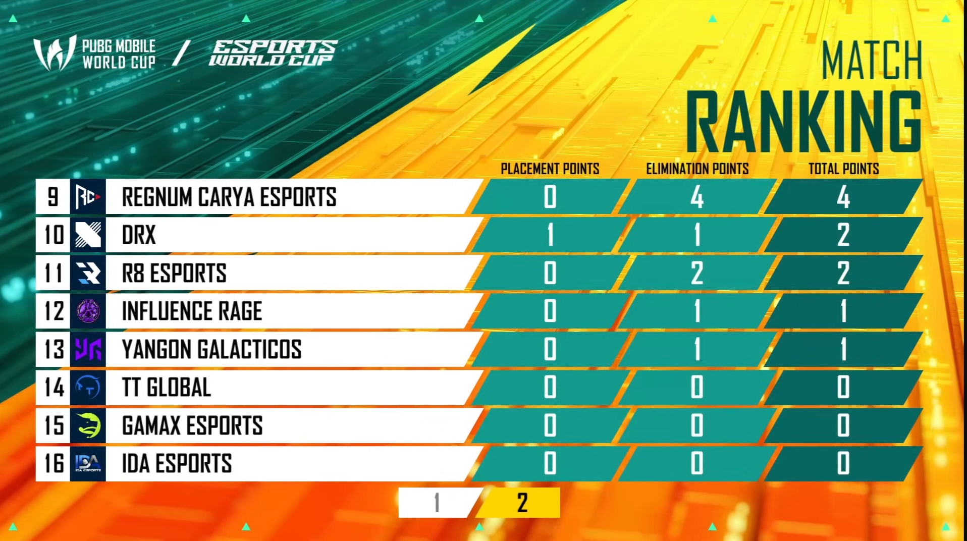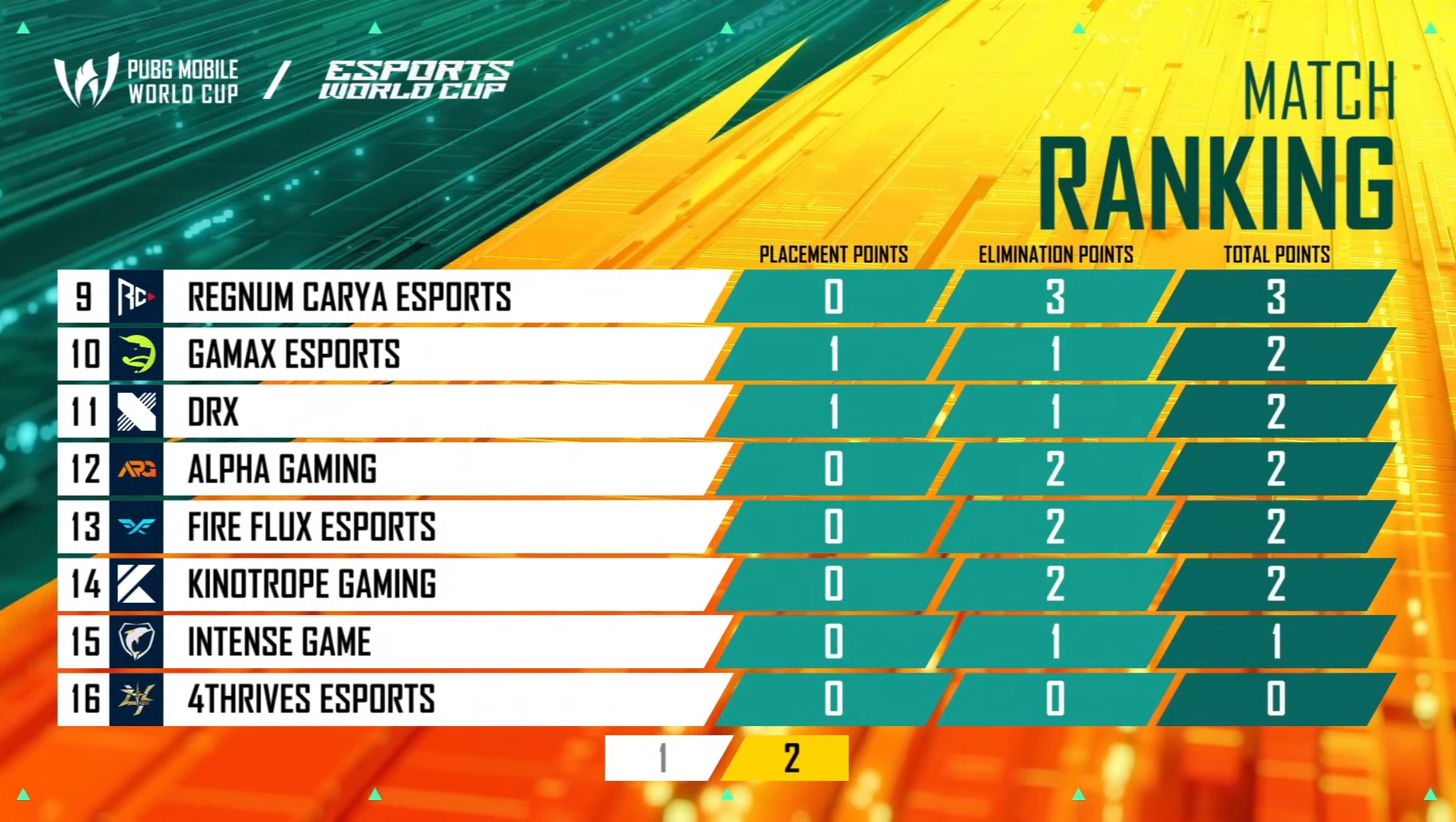 4Thrives from Pakistan continued to perform consistently on Day 2 and remained in the first position with 111 points and two Chicken Dinners. DRX and Team Secret were second and third with 89 and 86 points, respectively. Regnum Carya was fourth with 81 points.