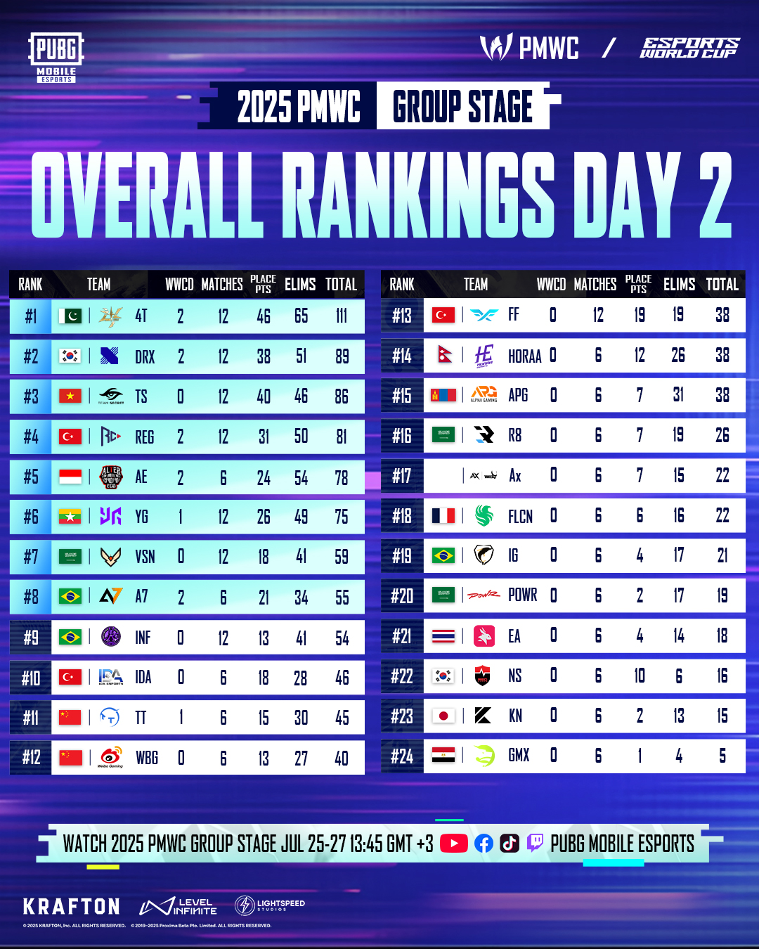 Day 2 of the PUBG Mobile World Cup (PMWC) 2025 took place on July 26, 2025, with teams from Groups Yellow and Green playing six matches. While teams from Group Yellow have participated in all 12 of their matches in the stage during the first two days, Group Red and Green have played only six of their matches. The third and final day of the Group Stage will take place on July 27, 2025.