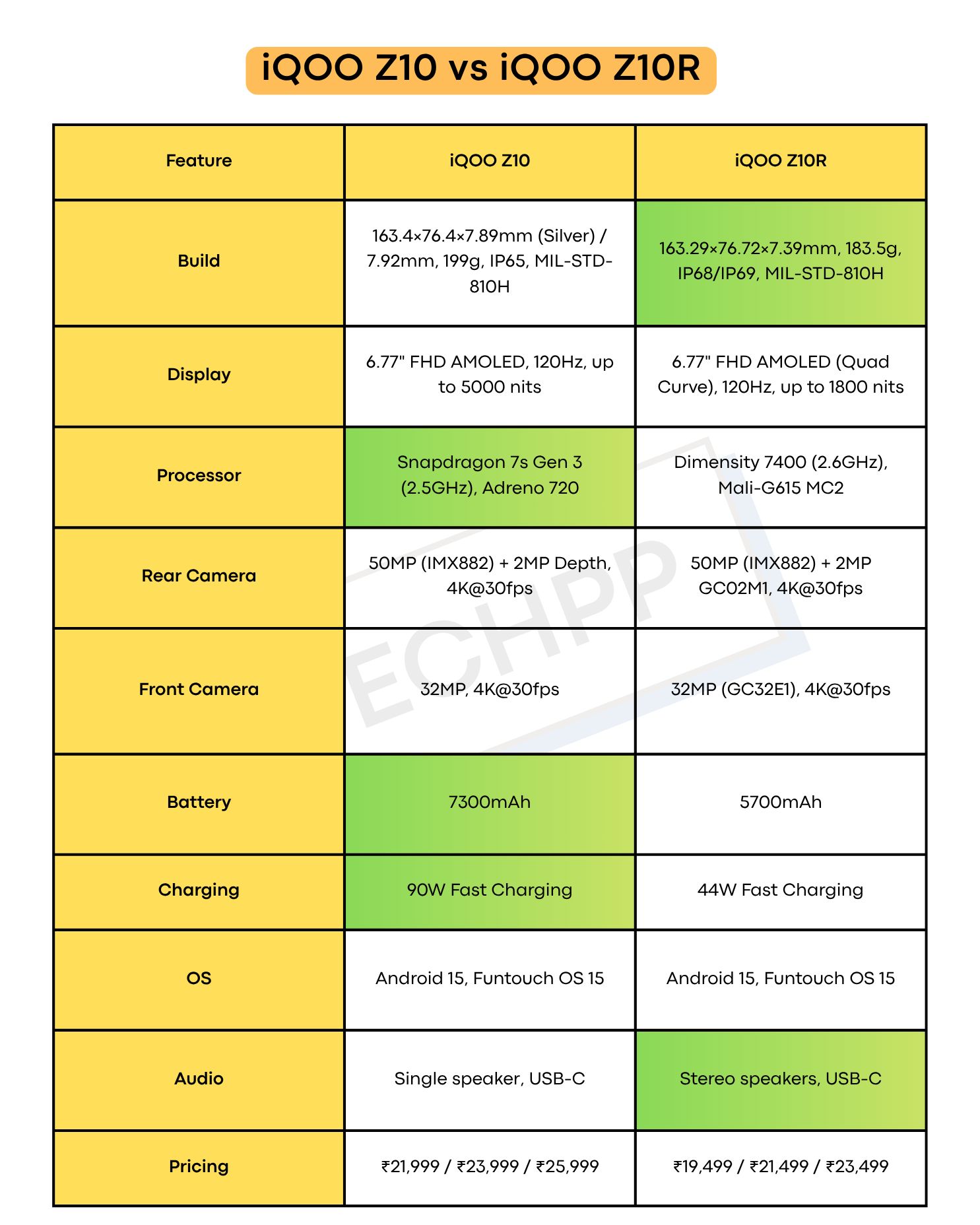iQOO has launched two new smartphones in its Z-series — the iQOO Z10 and the newer iQOO Z10R. Both phones come with a similar AMOLED display and a stylish look, but they are made for slightly different needs. The Z10 is all about a big battery and fast charging, while the Z10R is lighter, more durable (IP68/69), and has a better front camera. Let's quickly see what makes them different.