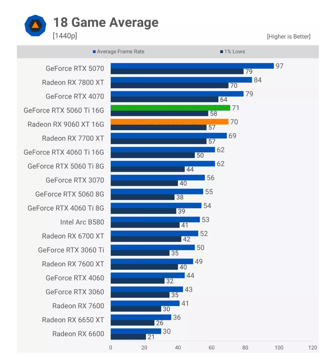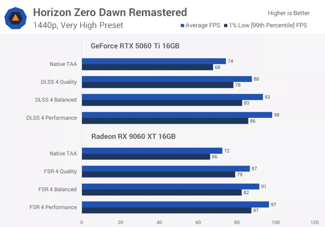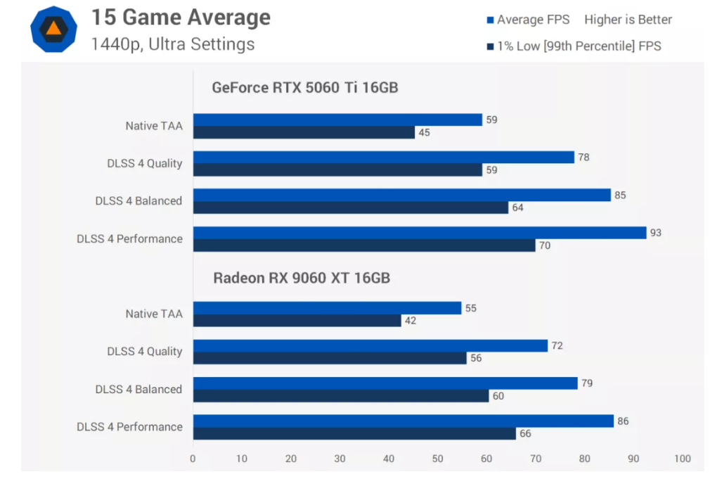 At the moment, the best-value option in this price range remains the Radeon RX 9060 XT 16GB, which can currently be found for as low as $360 to $370. The GeForce RTX 5060 Ti 16GB is occasionally available at $450 but is more often priced at $480 or higher.That makes the GeForce card roughly 25 to 35 percent more expensive, for at best a 10 percent performance advantage, as shown today when comparing Quality upscaling at 1440p. Across a broader set of games, we would expect the performance margin to drop into the single digits.The more meaningful difference between these two products lies not in raw performance, but in the overall quality of the upscaling technology. DLSS 4 generally produces better visual results than FSR 4 at resolutions like 1440p, which are typical for mainstream GPUs.While FSR 4 is certainly usable and has its strengths, DLSS 4 often provides more consistent visual stability. You can learn more about this in our DLSS 4 vs FSR 4 feature articles.