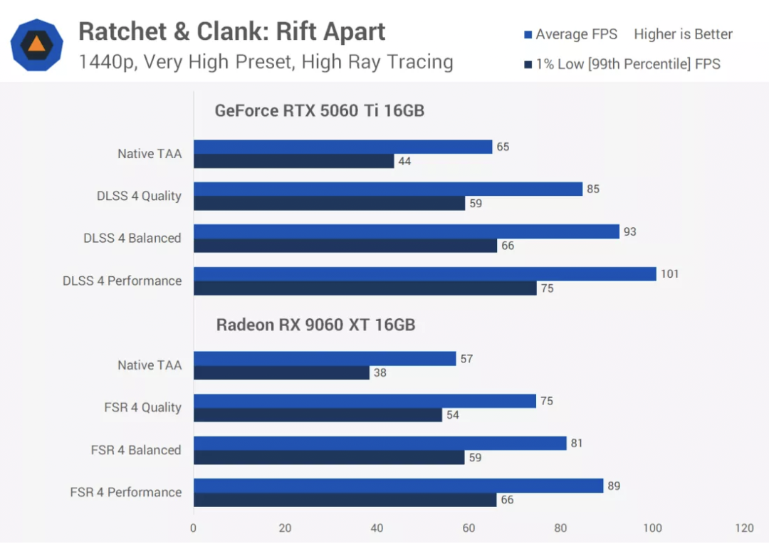 Ratchet & Clank: Rift Apart is quite playable on these mid-range GPUs, even while using the highest preset with ray tracing set to High. In this configuration, the GeForce GPU is 14% faster across all upscaling settings. Despite the 5060 Ti's advantage in ray tracing, the 9060 XT still delivers playable performance. With FSR 4 set to Quality, it achieves an average of 75 FPS, which is solid for this type of game.