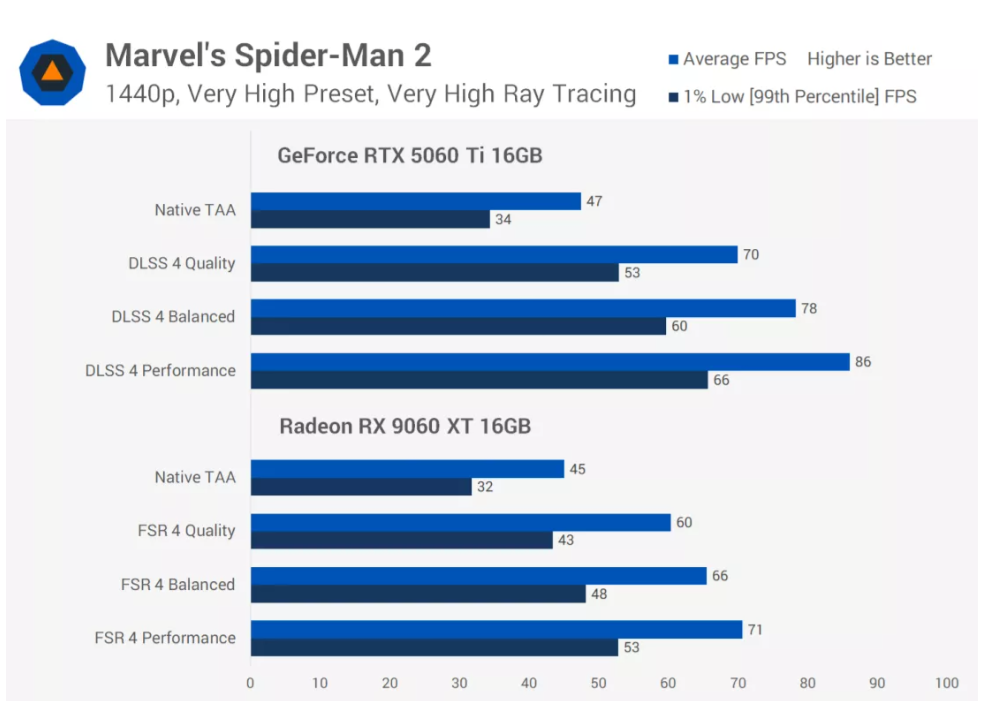 In Spider-Man 2, tested with the Very High preset and Very High ray tracing, the GeForce GPU starts with a modest 5% lead at native 1440p. This advantage increases with upscaling: DLSS 4 boosts performance by 49% on the 5060 Ti, while FSR 4 improves performance by only 33% on the 9060 XT. As a result, the 5060 Ti extends its lead to 16% with Quality upscaling and 20% with Balanced. Both cards reach a 60 FPS average with upscaling, though the GeForce card is clearly faster.