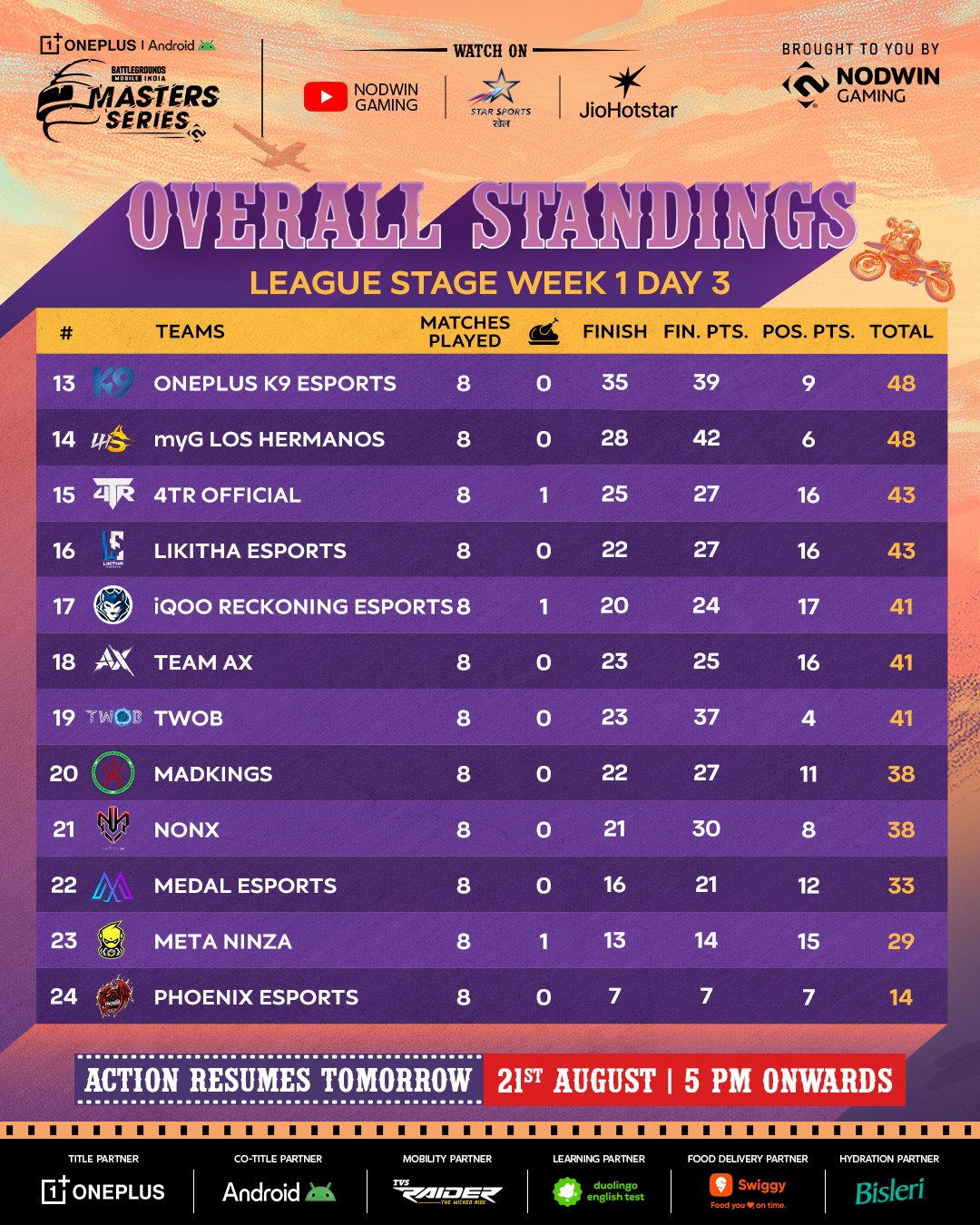 True Rippers and Victores Sumus have scored 52 points each at the end of Day 3, while K9 Esports and Los Hermanos have collected 48 points each. Reckoning, Aryan, and TWOB have accumulated 41 points each. Lastly, Meta Ninza and Phoenix placed in the bottom two, with 29 and 14 points, respectively.
