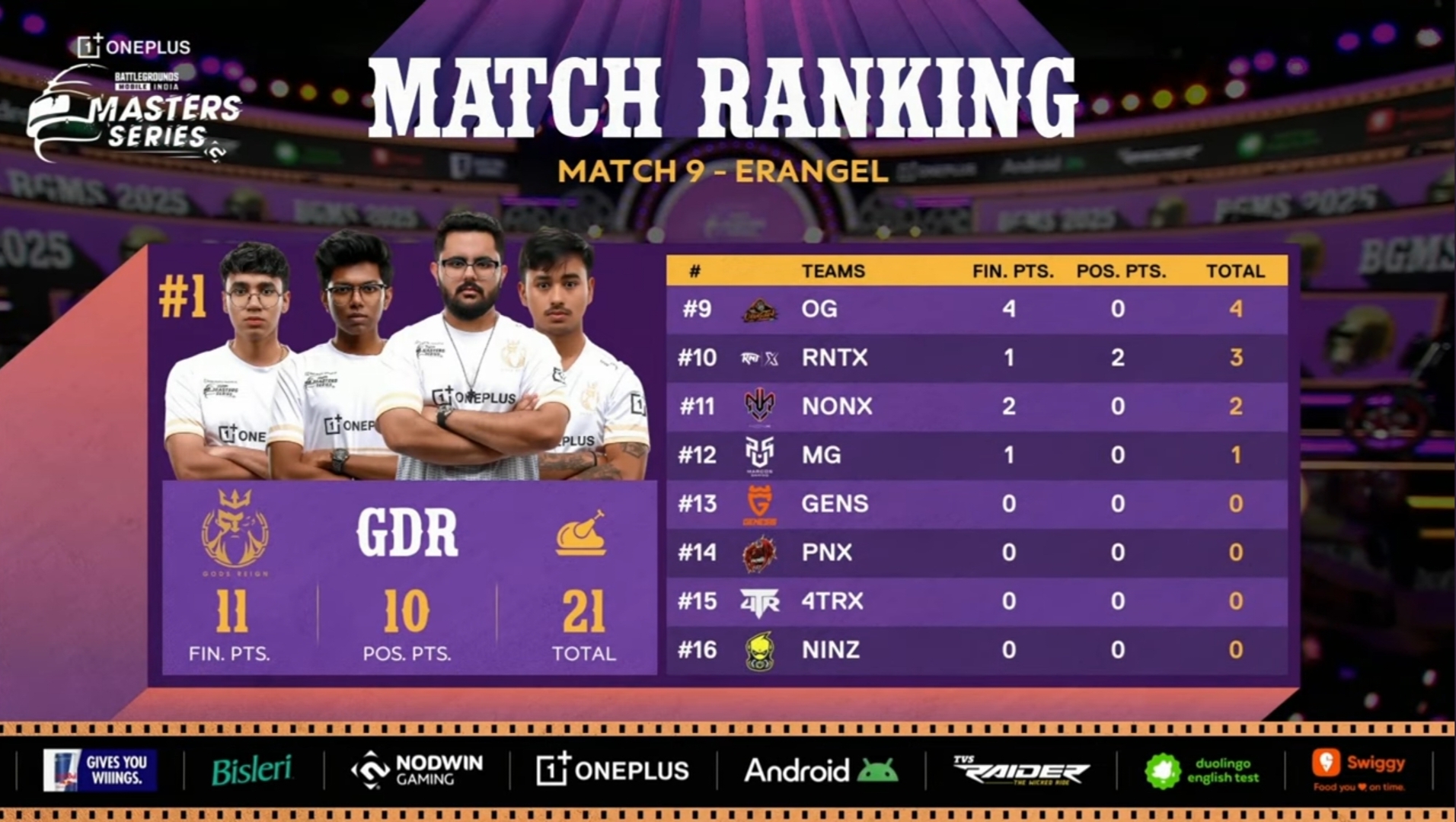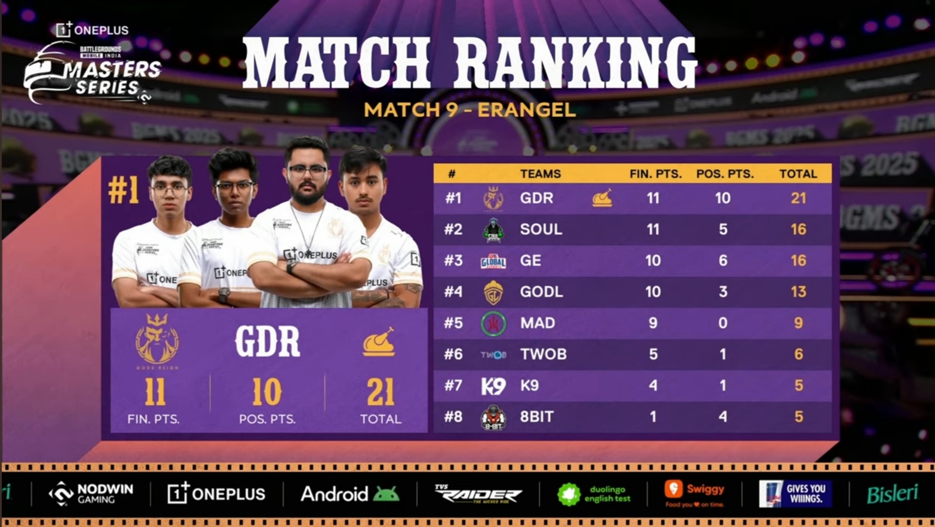 GodLike registered its third Chicken Dinner of the BGMI Masters with 21 points. K9 Esports added 12 points to its tally, while 8Bit, FS, and Likitha each secured 11 points. Genesis accumulated nine points in this match.