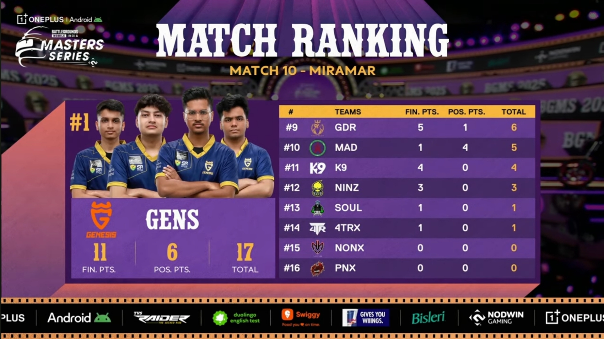 Global Esports ranked fifth with 62 points and one Chicken Dinner, followed by Genesis and Gods Reign at sixth and seventh, with 62 and 61 points, respectively. Team 8Bit ensured eighth place with 59 points, and Team Soul slipped to ninth with 56 points.