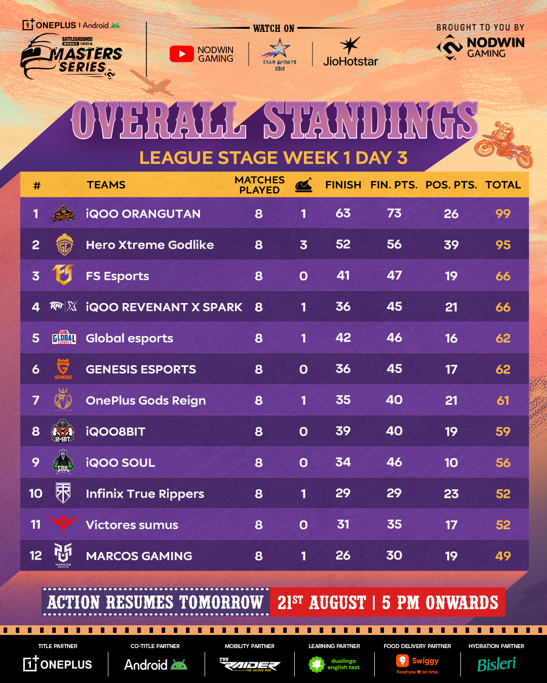 Day 3 of the BGMI Masters Series (BGMS) 2025 League Stage came to an end on August 20, 2025. Orangutan Gaming came out on top, with 99 points after eight matches. Team GodLike performed well on Day 3 and jumped to second place on the leaderboard, with 95 points and three Chicken Dinners. FS Esports finished third, with 68 points, despite not winning any matches. Revenant XSpark was fourth with 66 points.
