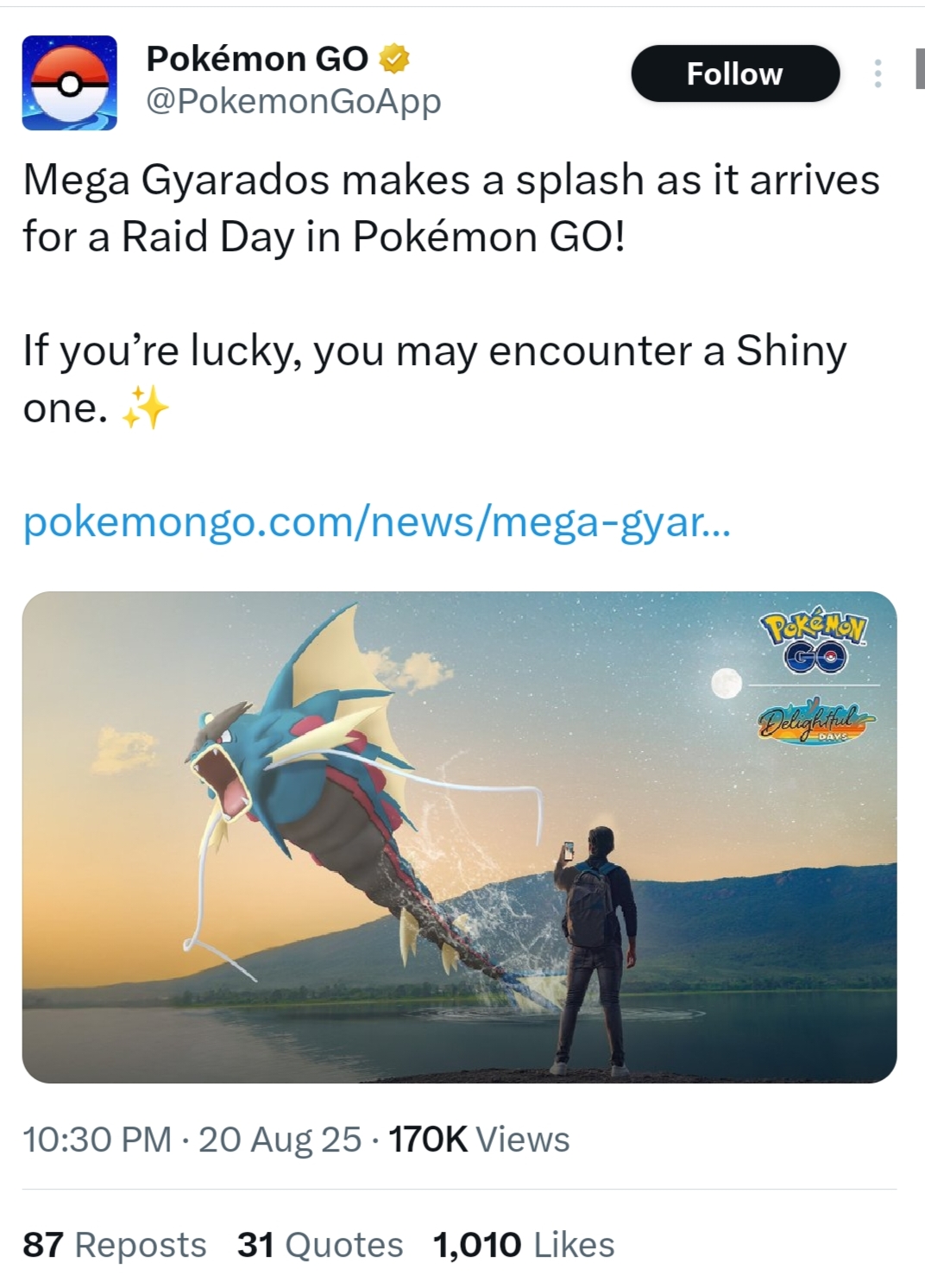 ⏰Increased chance of encountering Shiny Gyarados from Raids.