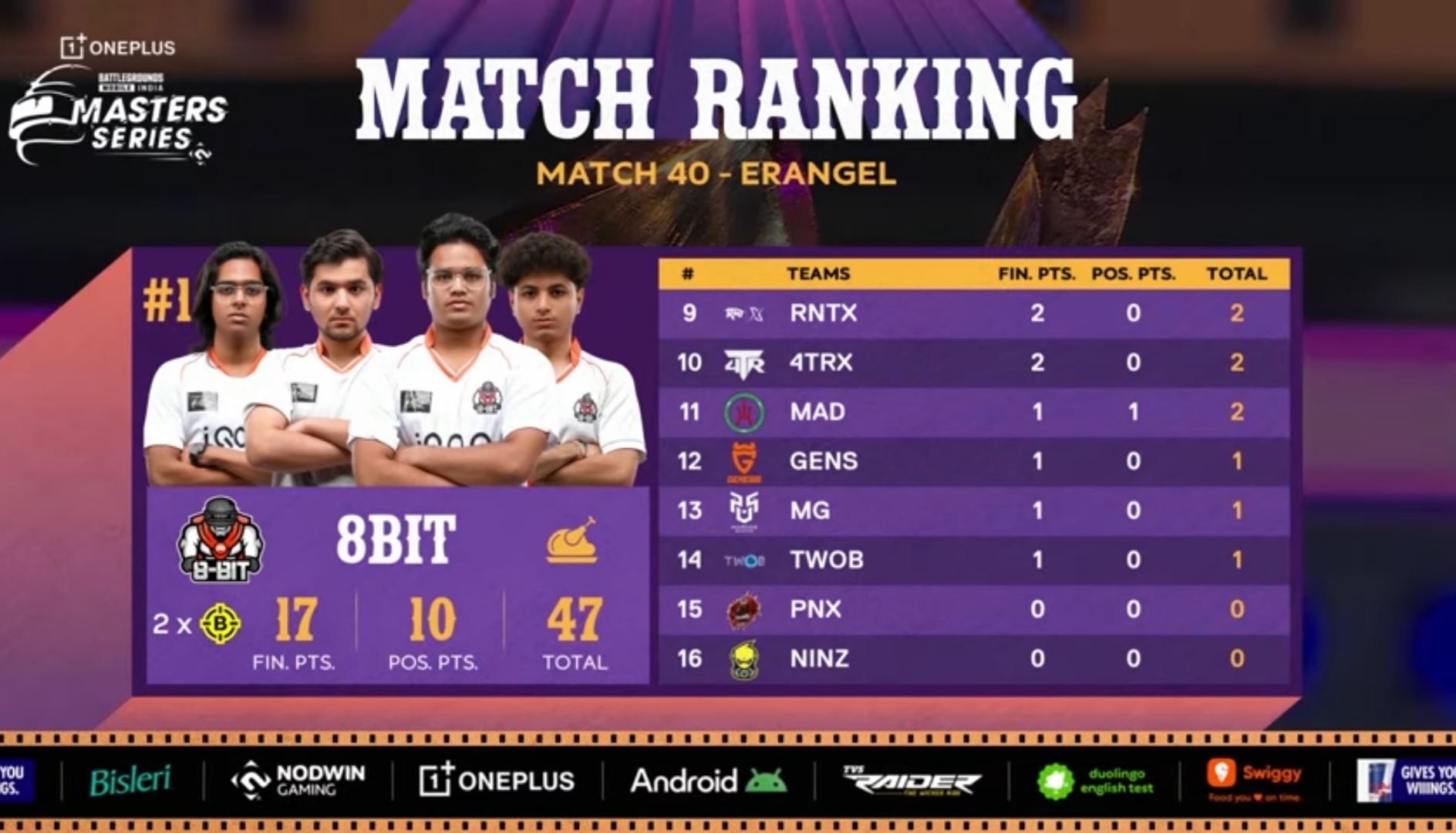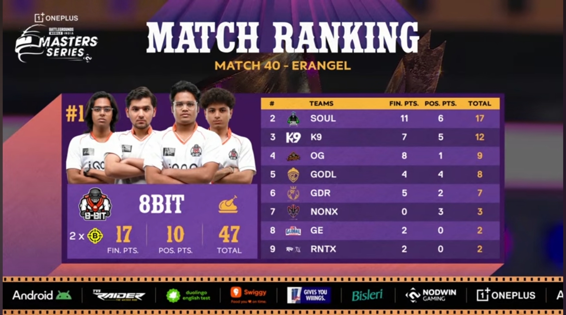 Team 8Bit was impressive in the last game of the day. The Raiden-led squad won their first Chicken Dinner of the BGMS with 47 points, including 20 bounty points. Team Soul earned 17 points.