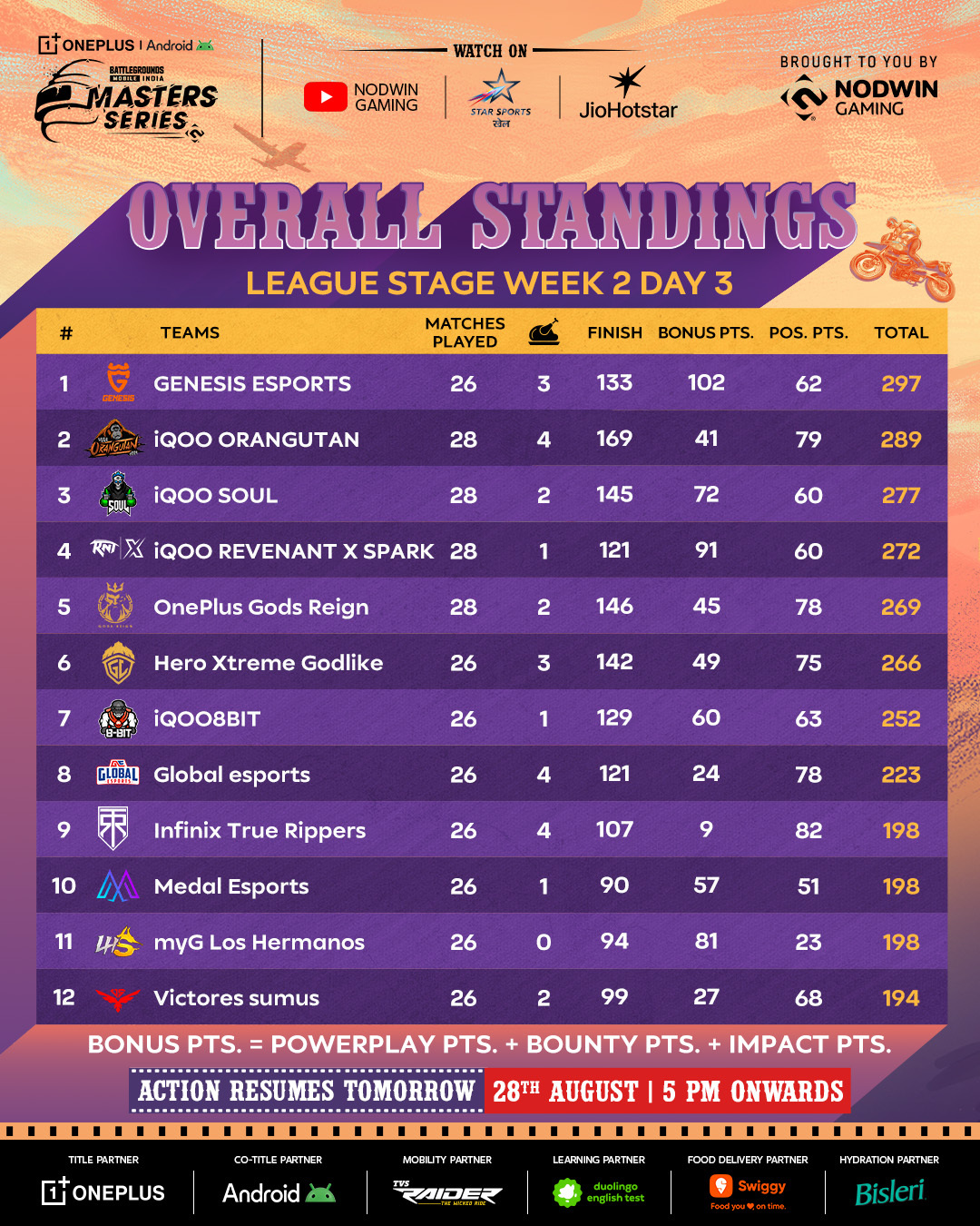 Gravity-led Genesis Esports remained in the top place after Day 3 of the BGMI Masters Series (BGMS) 2025 League Week 2. The squad has garnered 297 points, with 133 finishes and three Chicken Dinners. Orangutan bounced back on Wednesday and secured the second spot with 289 points and four Chicken Dinners. Team Soul ranked third with 277 points and two Chicken Dinners.
