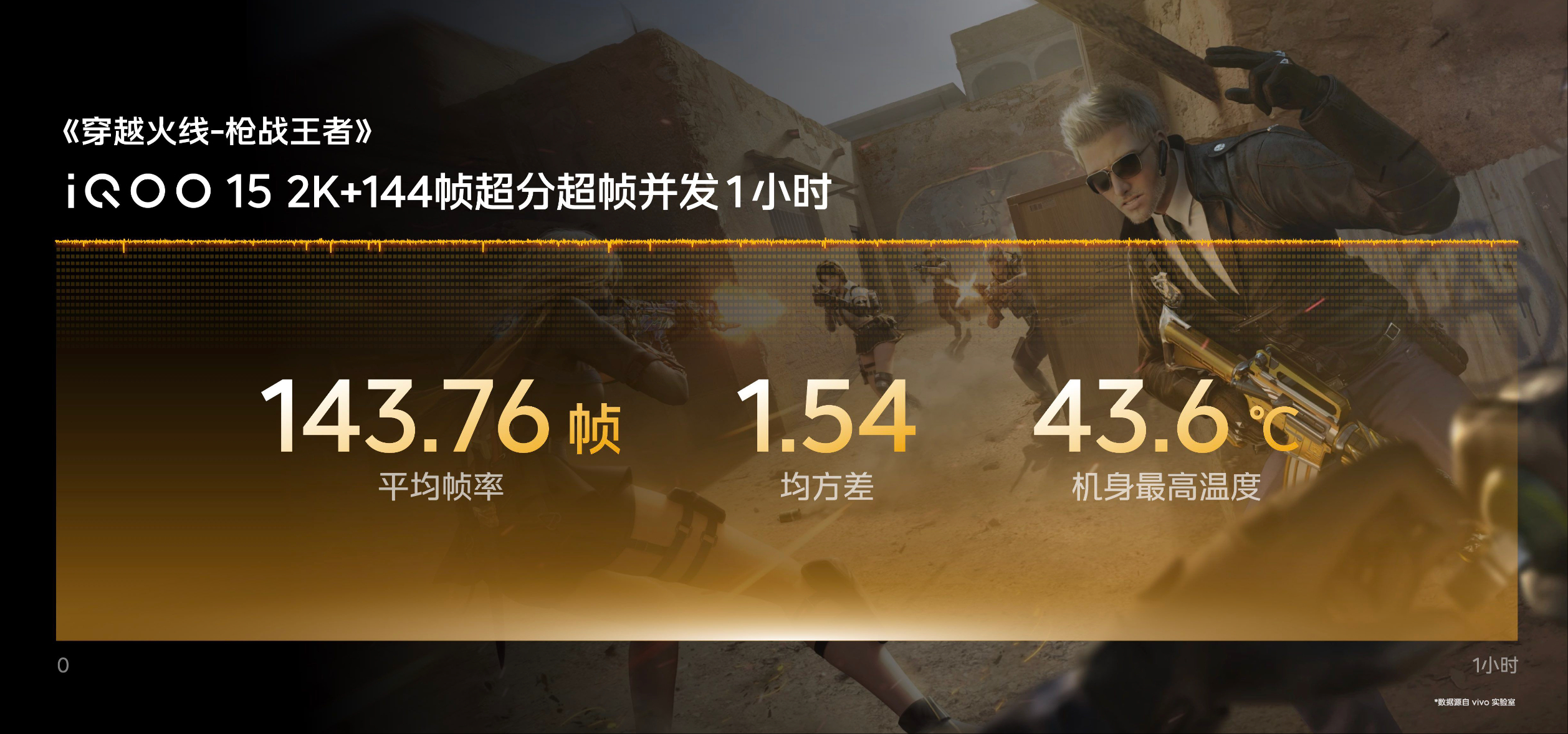 In iQOO's internal lab tests, the iQOO 15 maintained an average frame rate of 143.76 FPS, with a variance of just 1.54, during one hour of continuous gameplay. This means players experience near-perfect frame consistency - a crucial factor for competitive shooters where every millisecond counts.