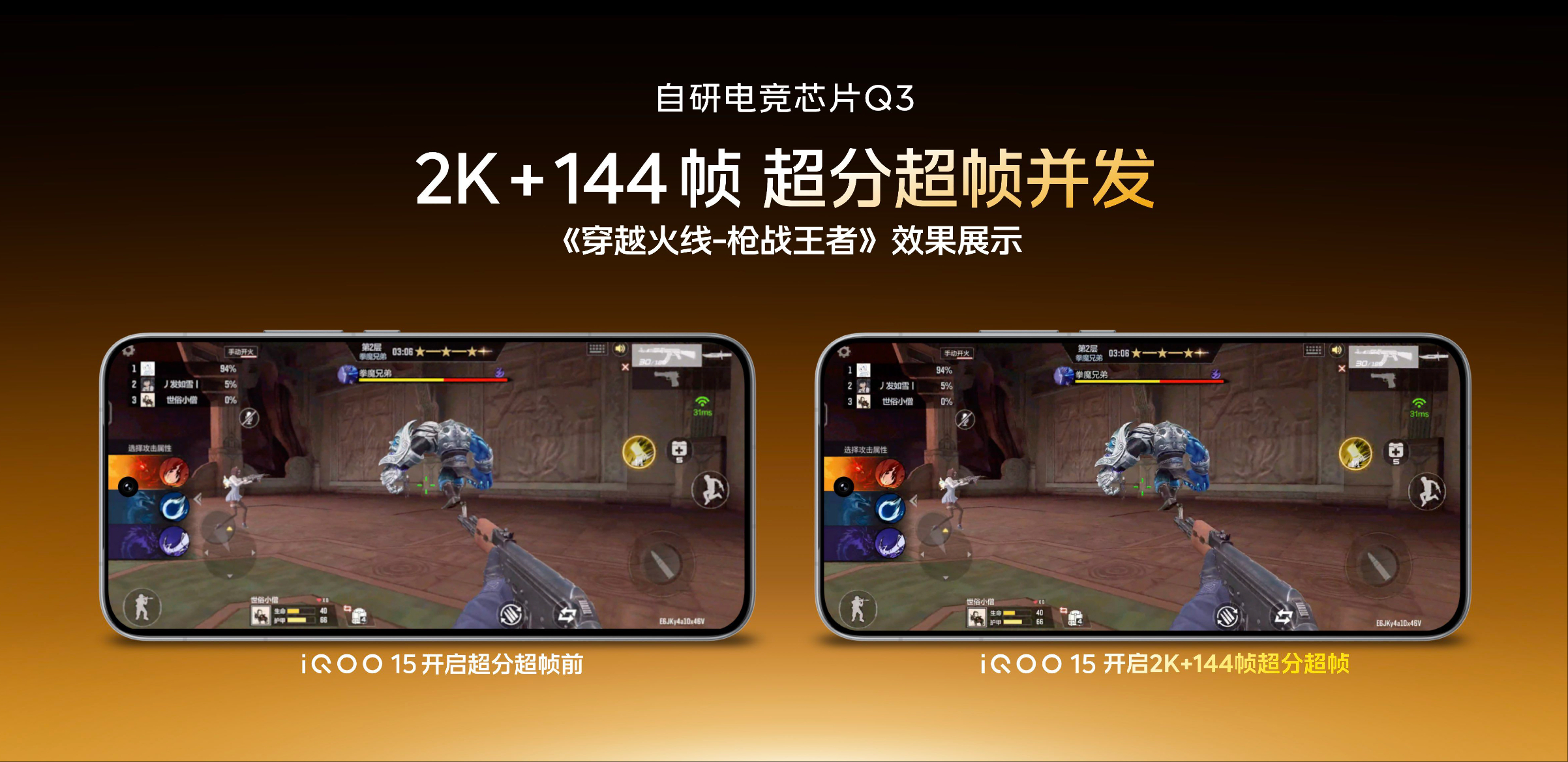 The side-by-side comparison showcased in iQOO's demo reveals the massive difference between standard and Q3-enhanced rendering. With 2K + 144Hz mode enabled, the game exhibits enhanced texture detail, smoother motion, and reduced motion blur - delivering a console-grade experience right in your hand.