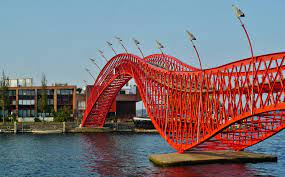 The bridge is famous for its distinctive wavy shape and vibrant crimson color, creating an eye-catching landmark that blends art and functionality.