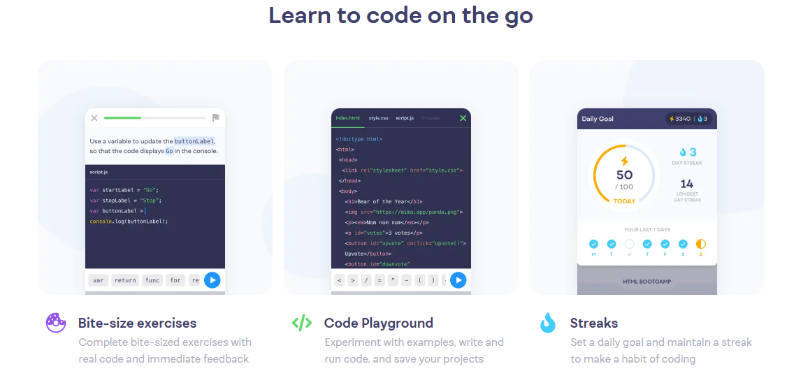 The Unique highlight of the Mimo app is that it offers an integrated development environment (IDE) on your mobile phone. Mimo's mobile-based IDE allows you to work on your coding projects without having to turn on a computer.