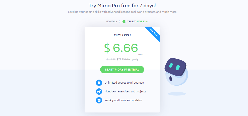 Mimo Pro is a subscription in the Mimo app that grants you access to extra features for a month or a year. These perks vary from unlimited hearts and playgrounds to certificates of completion, a monthly streak freeze, and ads-free learning. Mimo offers a free trial to its Pro subscription that can be canceled anytime.