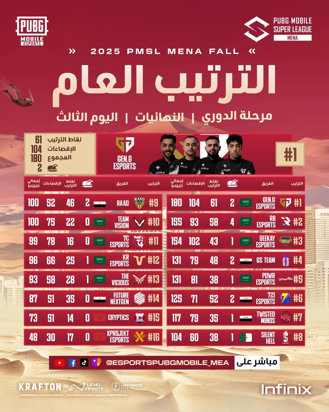 The PUBG Mobile Super League (PMSL) 2025 MENA Fall concluded on October 18. A total of six teams from the Middle East and North Africa region have advanced to the Global Championship (PMGC) 2025. Popular club Gen.G Esports became the undisputed champion of the Fall edition of the Super League. The squad exhibited amazing consistency in the Grand Finals.