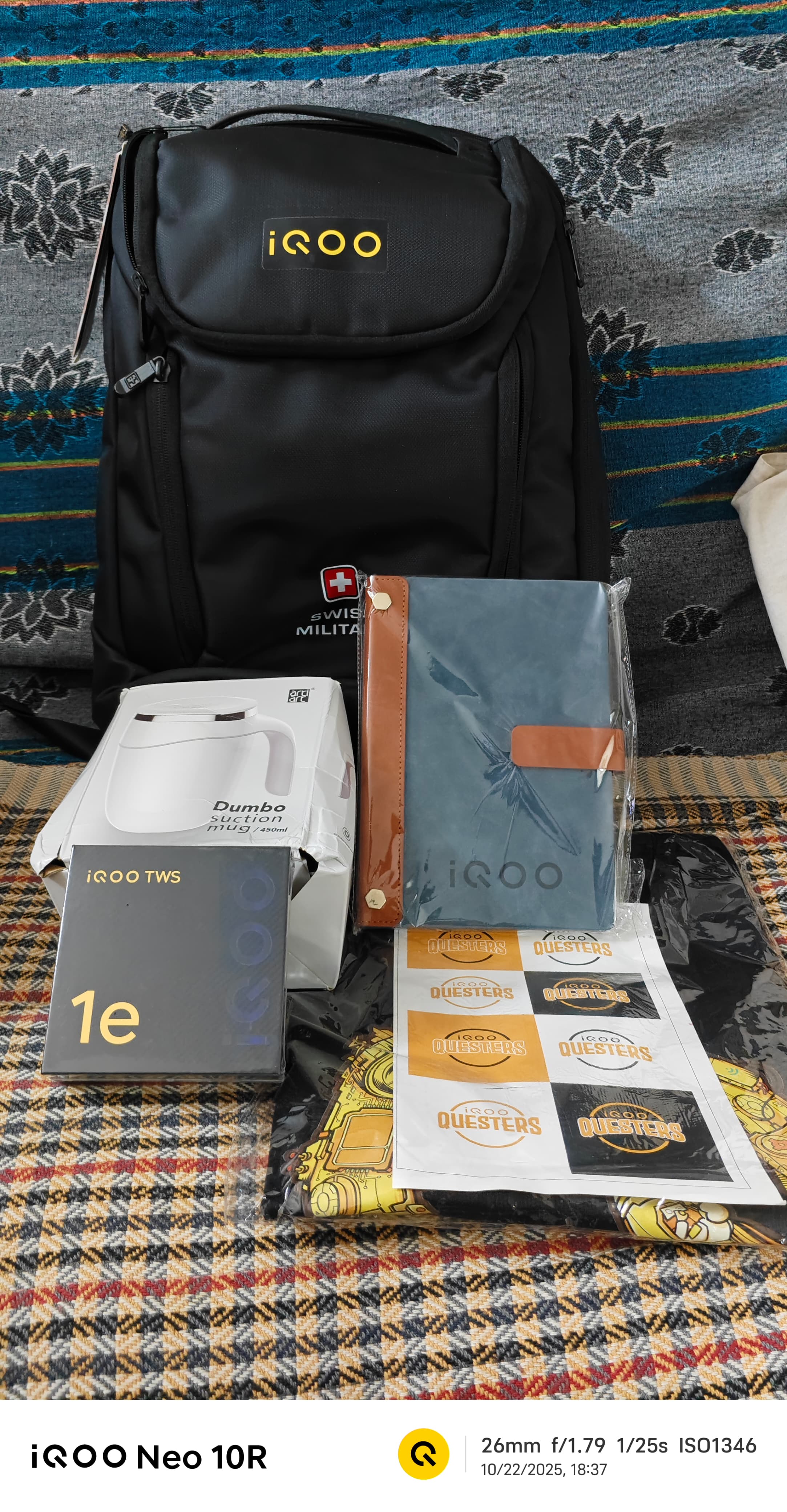 The kit includes a premium Swiss Military 21L backpack, iQOO TWS 1e ANC earbuds, a Dumbo Suction Mug, iQOO diary, stickers, and a cool iQOO T-shirt — all packed with the signature iQOO spirit of performance and style.