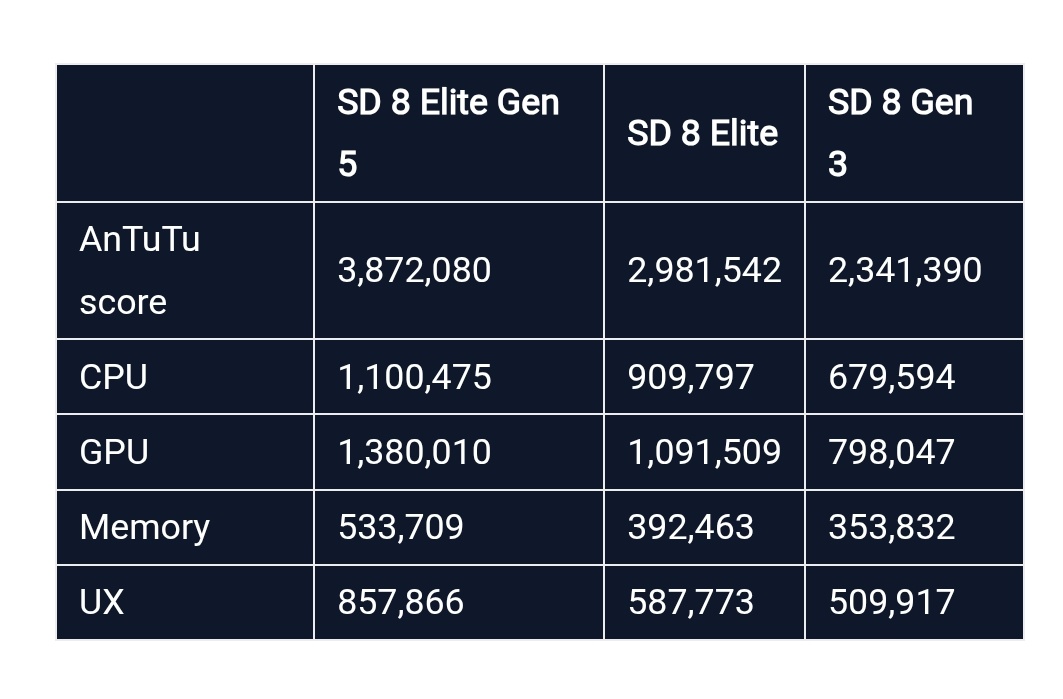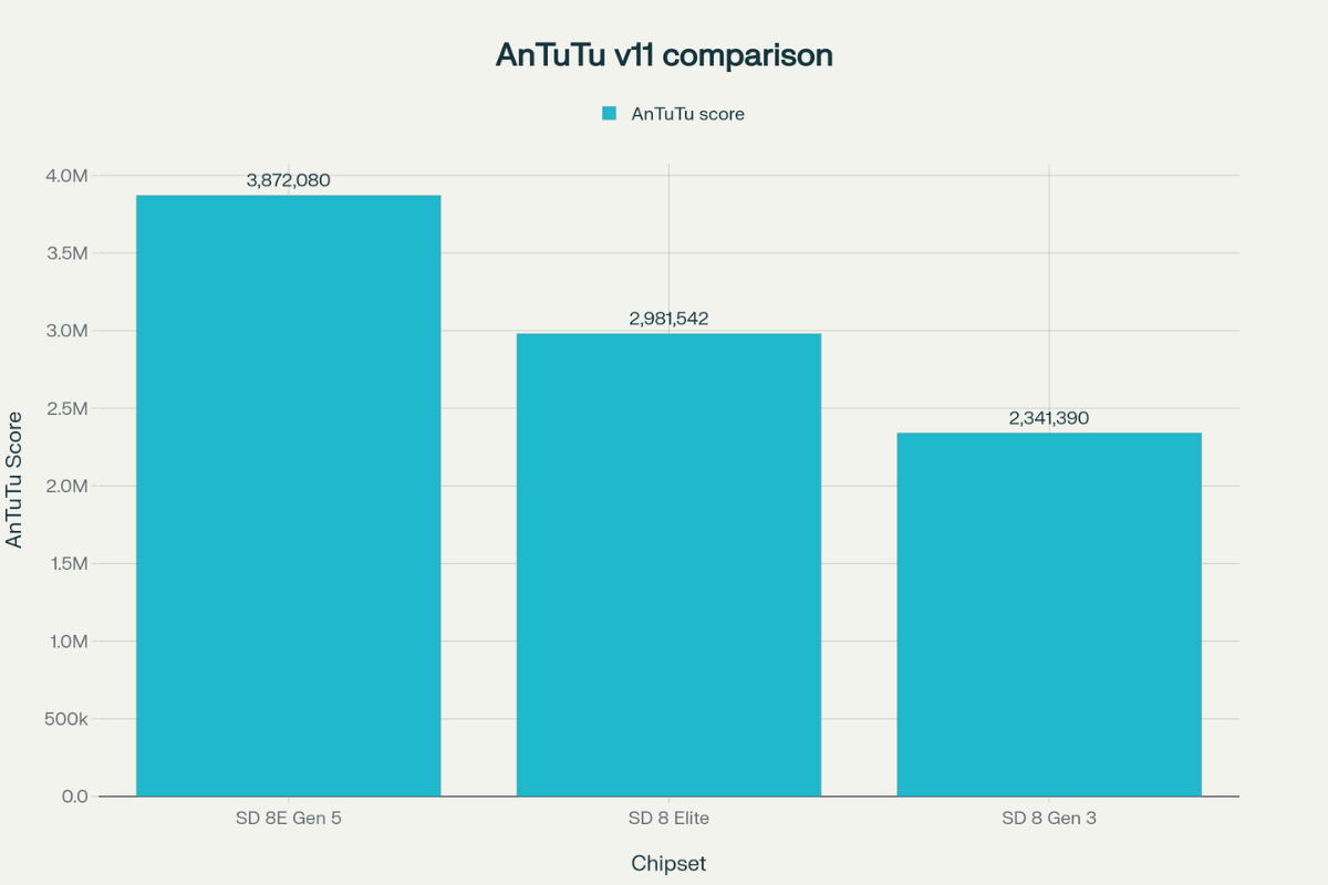 On the AnTuTu v11 benchmarking platform, the Snapdragon 8 Elite Gen 5 gets a total score of 3,872,080 points, which is about 30% higher than Snapdragon 8 Elite (2,981,542 points) and 65% higher than Snapdragon 8 Gen 3 (2,341,390 points).
