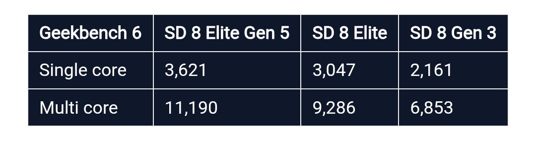 The fifth-gen Elite chipset posts a total of 3,621 single-core points, which is about 19% higher than Snapdragon 8 Elite (3,047 points) and 68% higher than the Snapdragon 8 Gen 3 (2,161 points). The increase over last year’s Elite chipset may seem modest, but that’s a massive leap over 8 Gen 3.