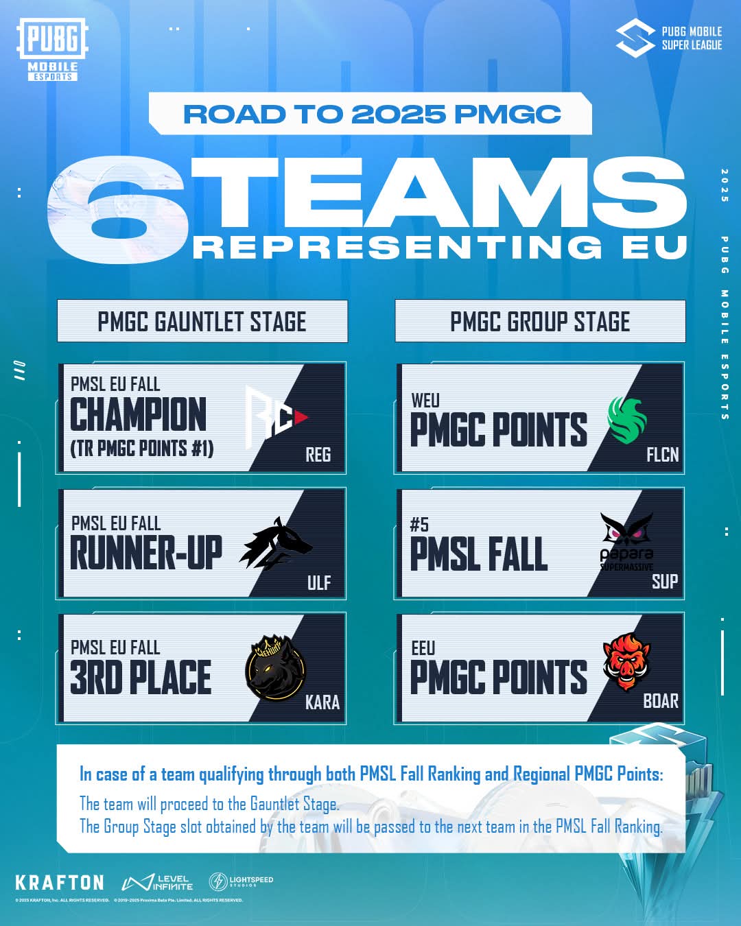 The PMSL 2025 Europe Fall was played from October 13 to 26. In total, 24 teams from the region competed there. The Grand Finals took place from October 24 to 26, featuring the Smash Rule. A total of six teams from the European region have moved to the PUBG Mobile Global Championship (PMGC) 2025.