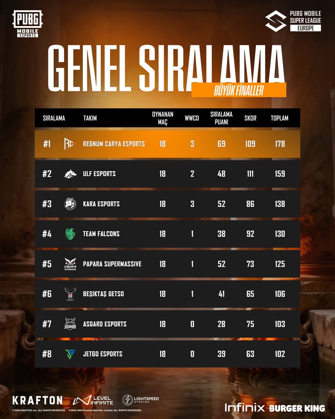 Regnum Carya had a fabulous run in its last six matches as it leapfrogged ULF and won the event. The team scored 178 points in the finale with the help of three Chicken Dinners and 109 kills.