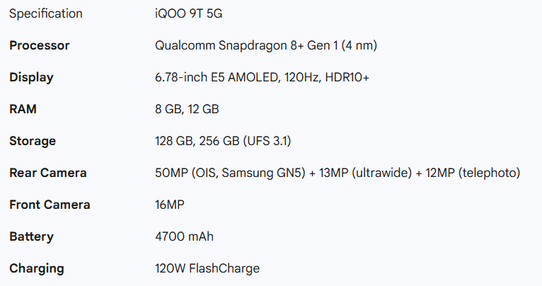 Launched on August 2, 2022, the iQOO 9T established a mid-year "T" refresh cycle for the flagship series in India. Its primary purpose was to integrate the upgraded Qualcomm Snapdragon 8+ Gen 1 chipset, which offered significant improvements in thermal efficiency and sustained performance over the 8 Gen 1 found in the 9 Pro. Starting at ₹49,999, it solidified iQOO's position in the premium performance category.