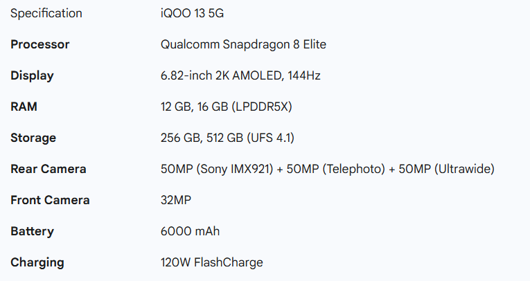 Set for a December 2024 launch, the iQOO 13 continues the brand's tradition of bringing the latest flagship silicon to the Indian market. Powered by the Snapdragon 8 Elite processor, it aims to set new performance benchmarks. The device features a large 6.82-inch 2K AMOLED display with a 144Hz refresh rate, a 6000mAh battery with 120W fast charging, and a versatile triple 50MP rear camera system. With a starting price expected to be around ₹56,999, it represents iQOO's commitment to the premium flagship segment.