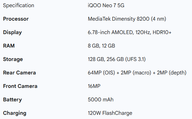 Launched on February 16, 2023, the iQOO Neo 7 represented a bold strategic pivot. It was the first smartphone in India to launch with the MediaTek Dimensity 8200 chipset, a move that challenged the Snapdragon dominance in this segment and showcased iQOO's confidence in MediaTek's high-end offerings. Coupled with an upgrade to 120W fast charging, the Neo 7, starting at ₹29,999, further solidified iQOO's reputation for bringing flagship-grade features to the mid-range.