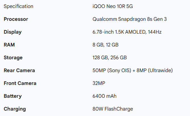 Scheduled for a March 2025 launch, the iQOO Neo 10R is set to target the upper mid-range with the powerful Snapdragon 8s Gen 3 processor. It continues the Neo series' focus on battery life with a massive 6400mAh battery paired with 80W fast charging. The device will feature a 1.5K 144Hz flat AMOLED display and a 50MP Sony OIS main camera, aiming to deliver a balanced, high-performance experience with a starting price of around ₹26,998.