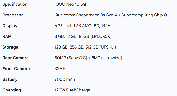 Expected in May 2025, the iQOO Neo 10 aims to push the performance envelope further with the next-generation Snapdragon 8s Gen 4 chipset and the dedicated Supercomputing Chip Q1. It is designed for extreme endurance, featuring a massive 7000mAh battery and 120W FlashCharge technology. The phone will also boast a 1.5K 144Hz AMOLED display and a 50MP Sony OIS main camera, positioning it as a top-tier performance device with a launch price anticipated to be around ₹31,998.