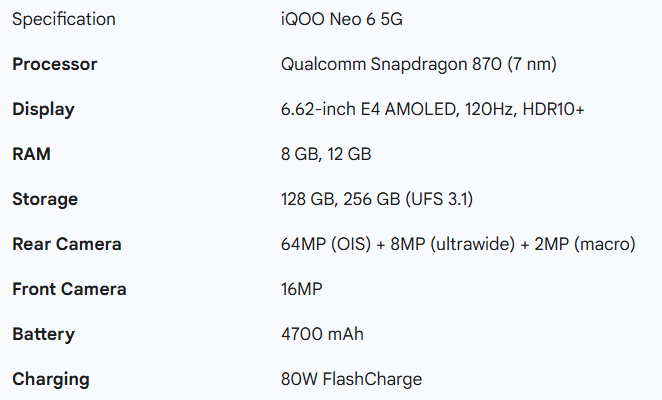The iQOO Neo 6, launched on May 31, 2022, marked the debut of the Neo series in India. It was a masterclass in strategic product adaptation. By equipping the Indian variant with the powerful yet thermally stable and cost-effective Snapdragon 870 chipset, iQOO established a new performance benchmark in the sub-₹30,000 category. With a starting price of ₹29,999, it immediately became a go-to recommendation for performance-oriented users on a budget.