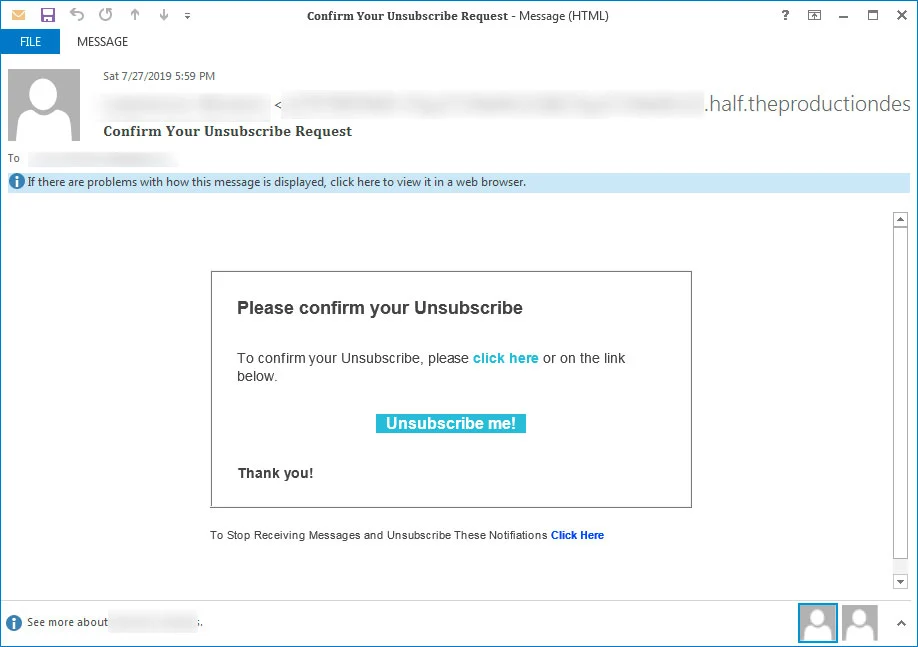 This is a popular ongoing scam that has a high success rate for hackers. Potential victims get an email for a product offer or other business invitation. The opt-out action step is enticing, looks familiar, and sounds reasonable. "Don't want to receive our emails? Click here to unsubscribe," it beckons.
