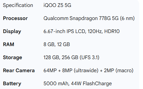 Following just a few months later on September 27, 2021, the iQOO Z5 demonstrated the brand's commitment to rapid, iterative upgrades. It moved to the more powerful Snapdragon 778G chipset, increased the battery capacity to 5000 mAh, and introduced stereo speakers, refining the formula established by the Z3. It launched with a starting price of ₹23,990.