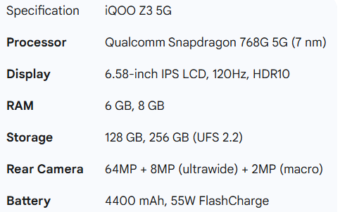 Launched on June 8, 2021, the iQOO Z3 was the first Z-series phone in India and immediately set the template for the series. It was India's first smartphone with the Qualcomm Snapdragon 768G processor, and it combined this powerful mid-range chip with a 120Hz display and 55W fast charging—a combination of features that was unprecedented at its starting price of ₹19,990.