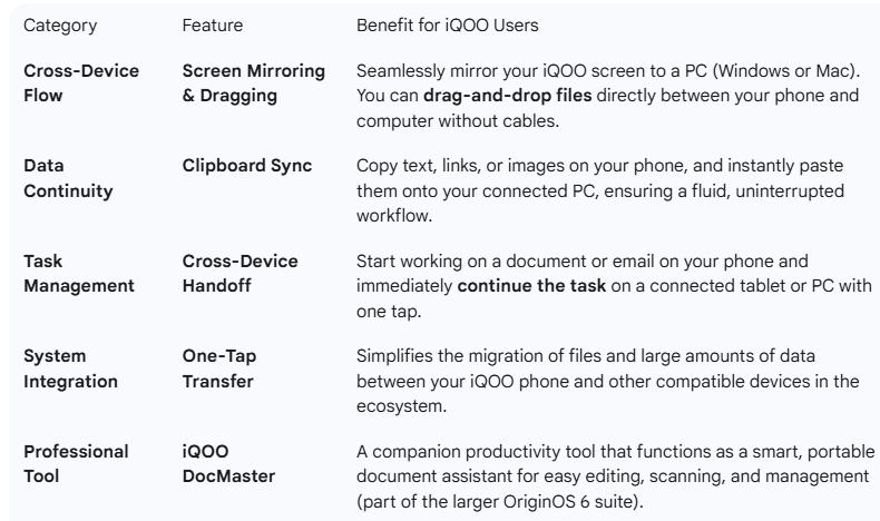 The Office Kit is a core productivity feature of the new OriginOS 6 software for iQOO devices. It transforms iQOO's powerful hardware into a seamlessly connected professional workstation, directly addressing the needs of non-gaming power users.