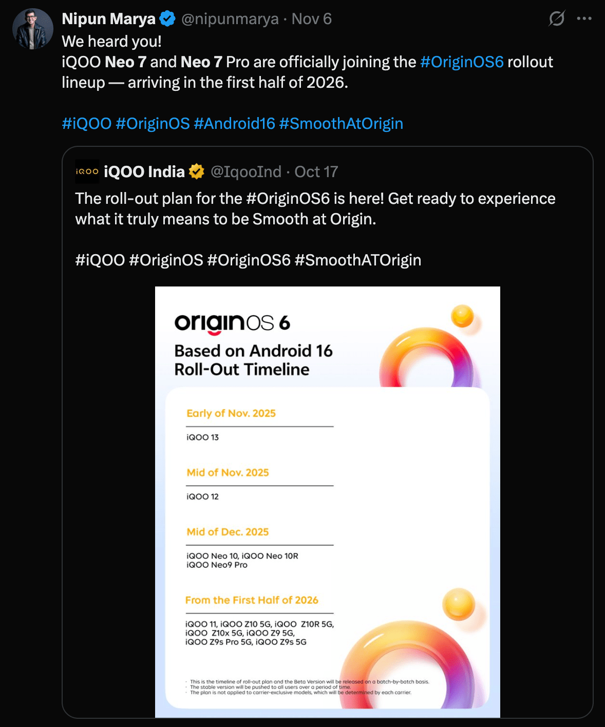 And recently, the brand started rolling out OriginOS 6, a complete overhaul of its software experience, replacing FuntouchOS 15. After community input, iQOO even added previously ineligible models like the iQOO Neo 7 and Neo 7 Pro to the update roadmap, both of which will receive the new OS in the first half of 2026.