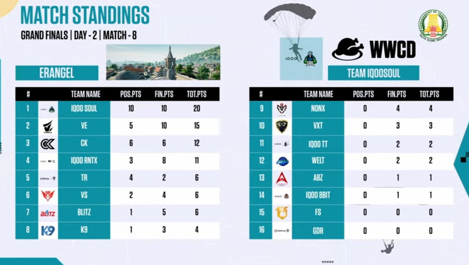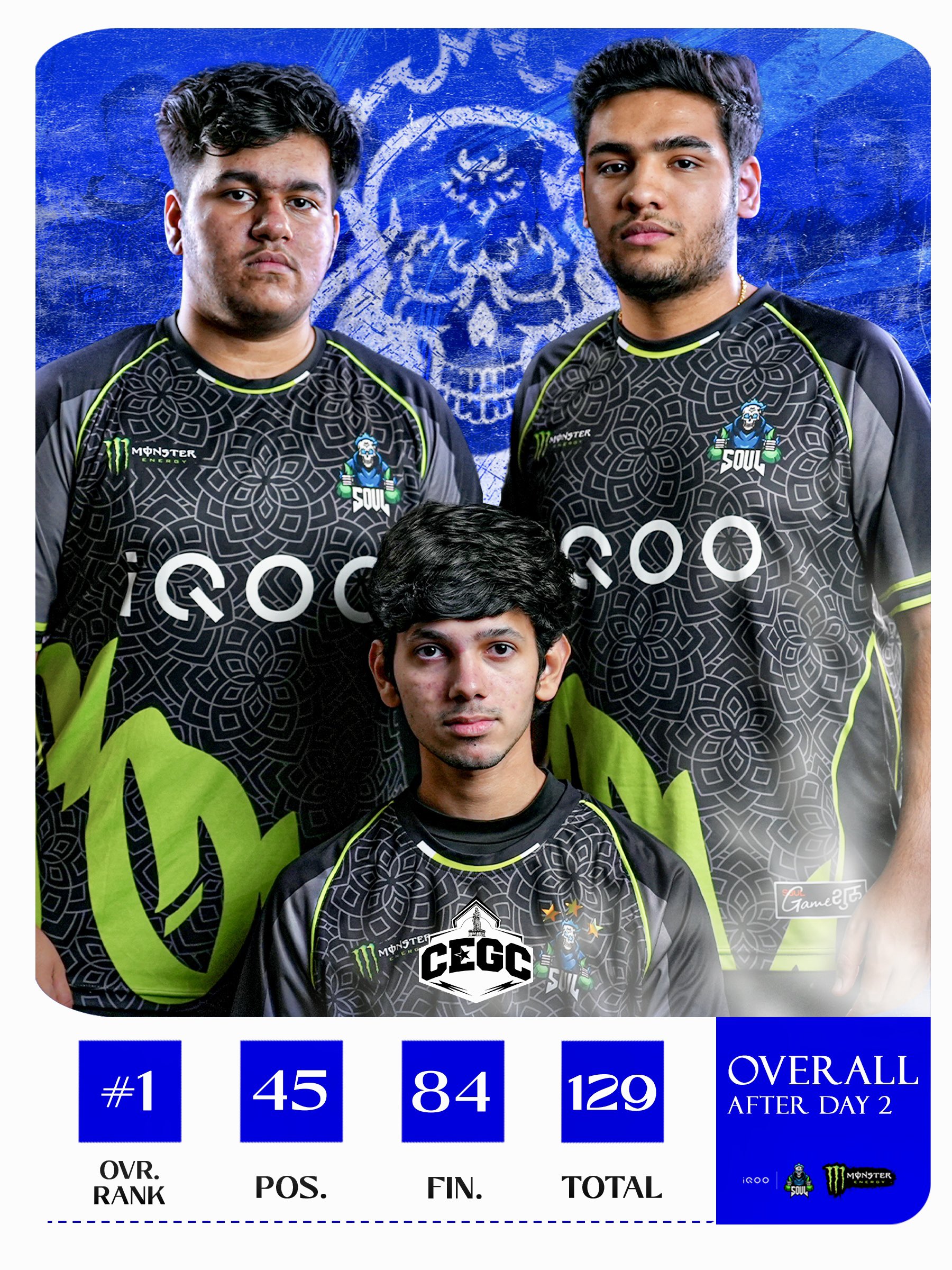 Team iQOO Soul remained in top spot after Day 2 of the CEGC 2025 BGMI Grand Finals. The team has accumulated 129 points with the help of 84 eliminations and three Chicken Dinners.