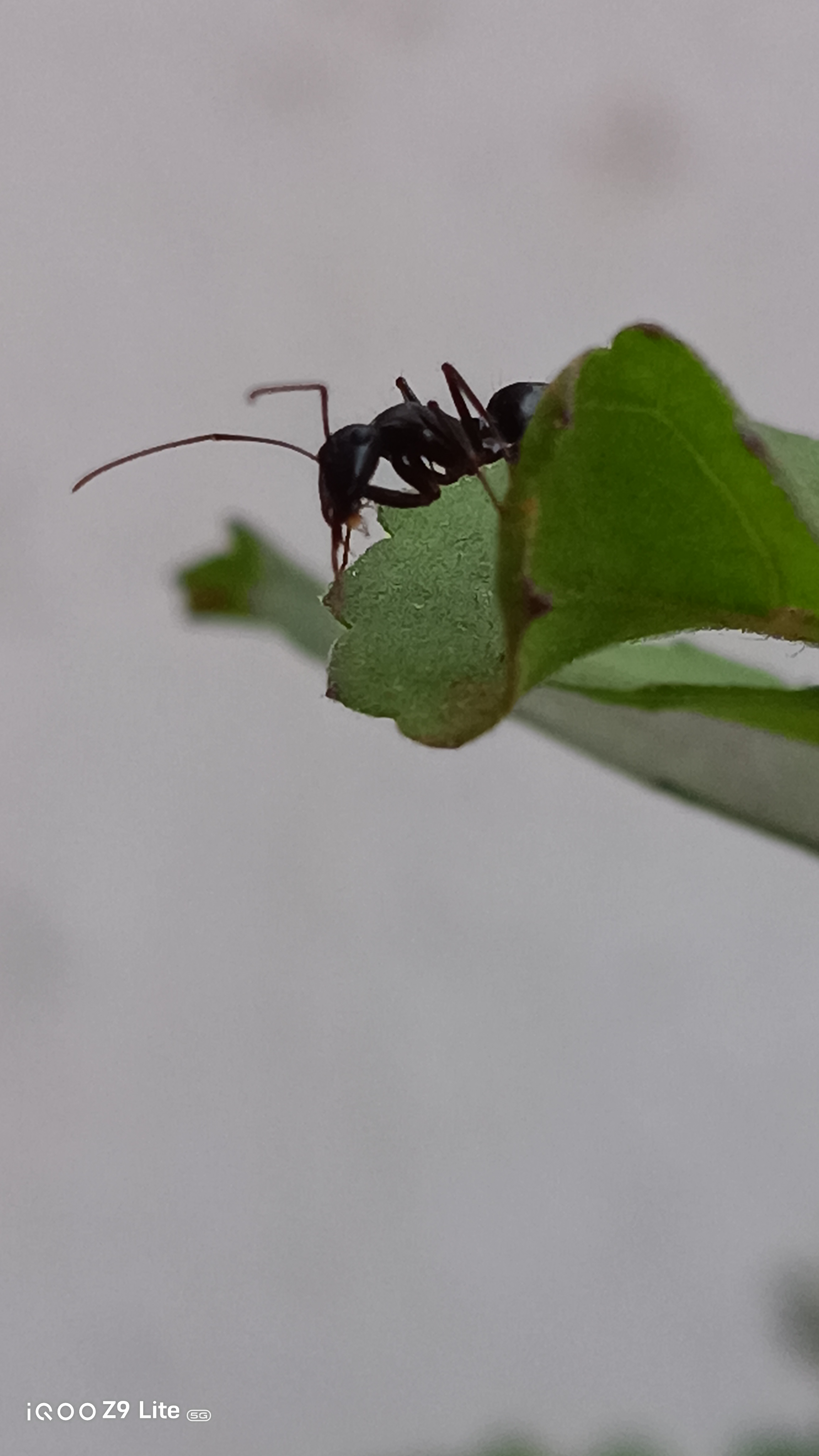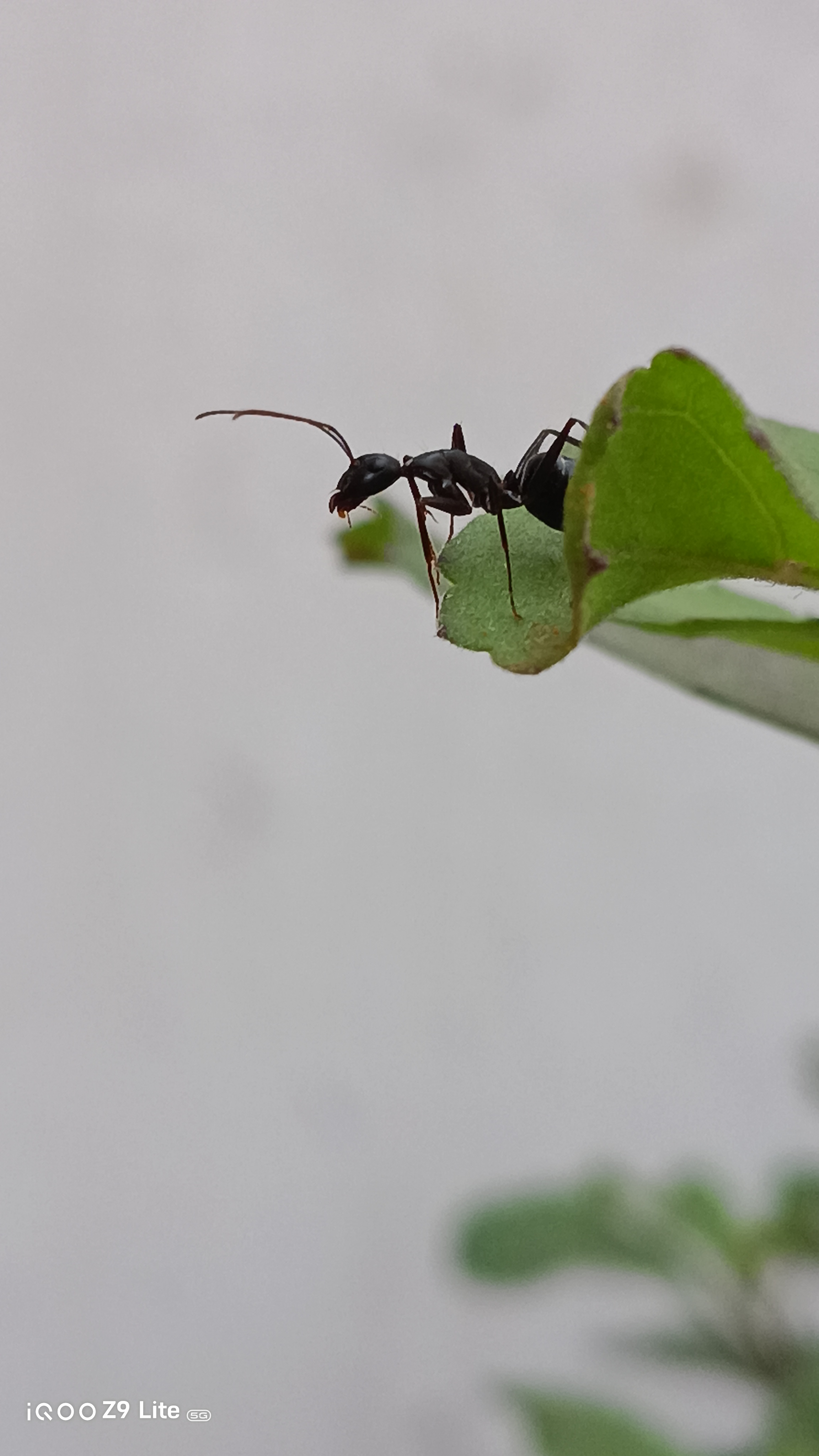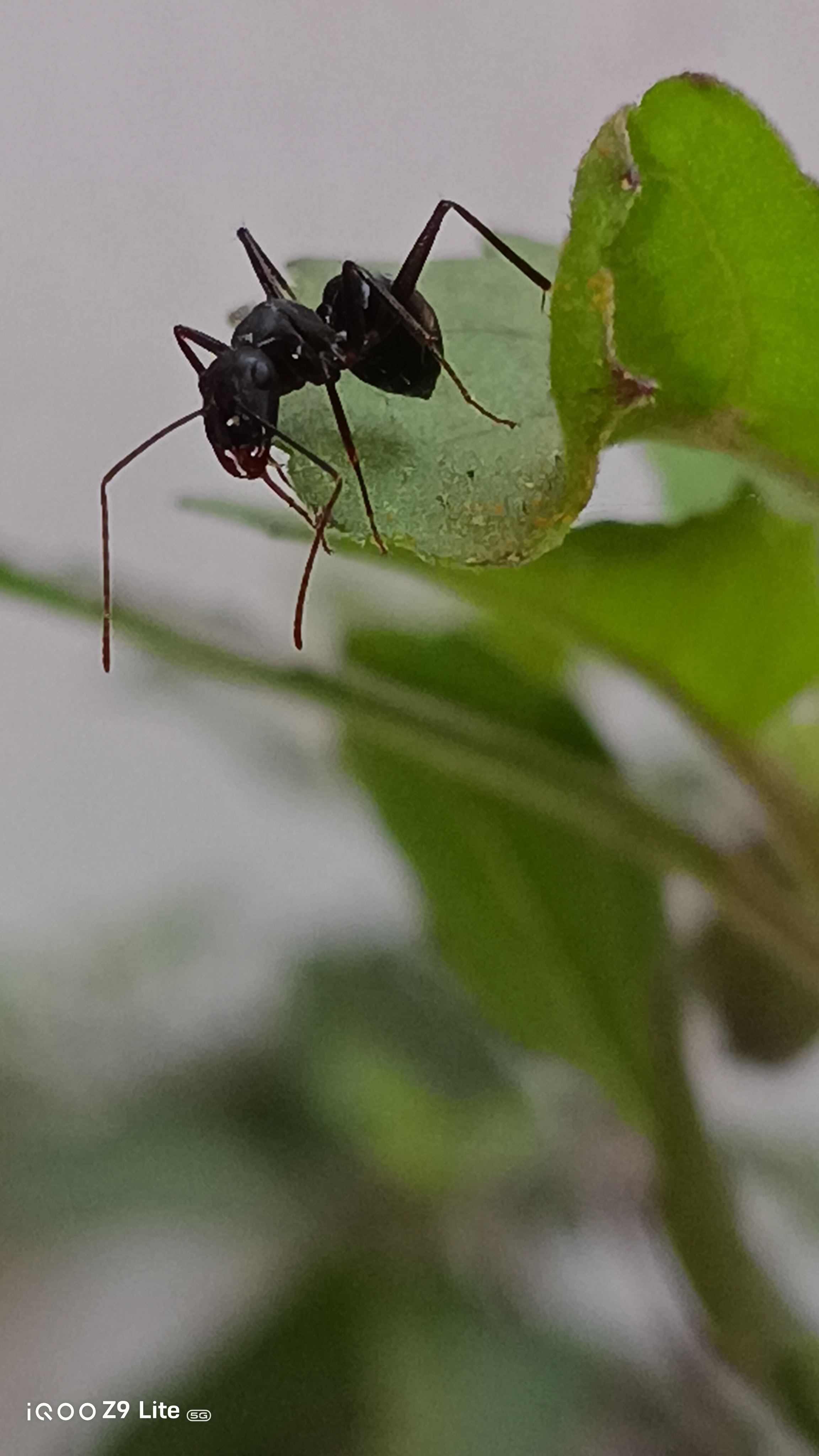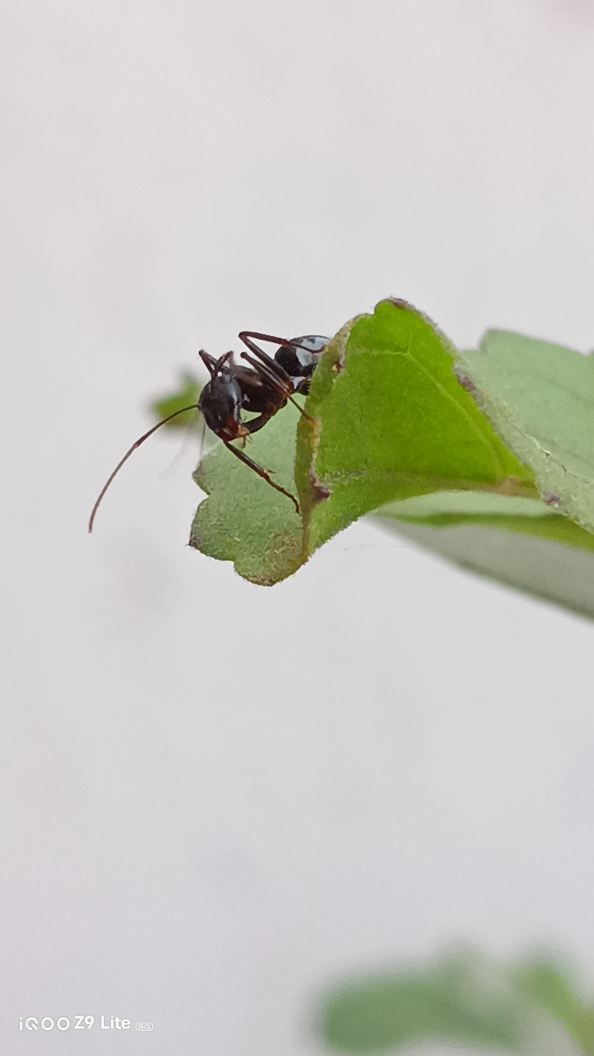 Below is one of the shots taken with the iQOO Z9 Lite, showcasing an ant silhouetted against vibrant green leaves. The photo captures fine details and the natural lighting beautifully, emphasizing the camera's macro capabilities.