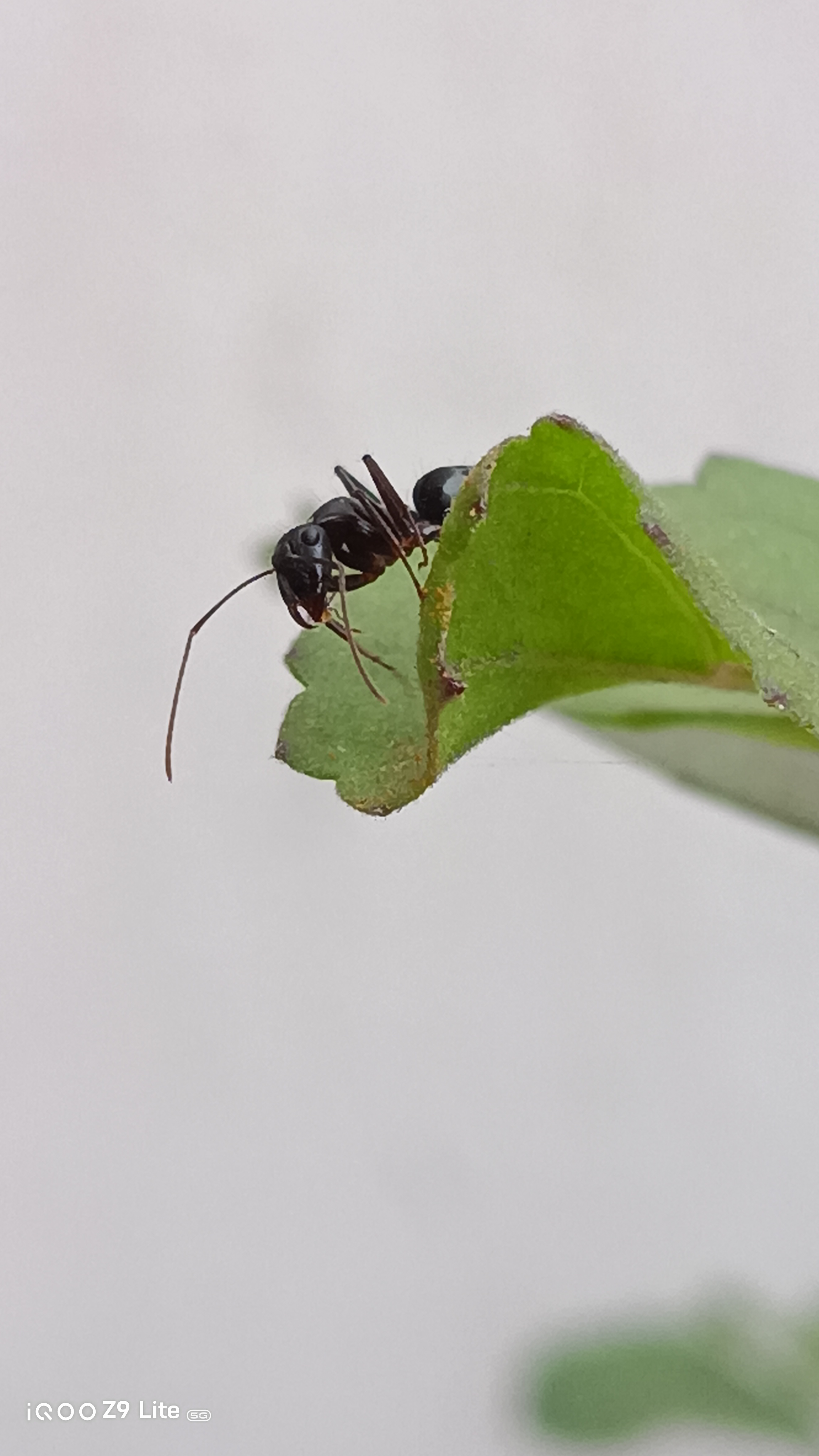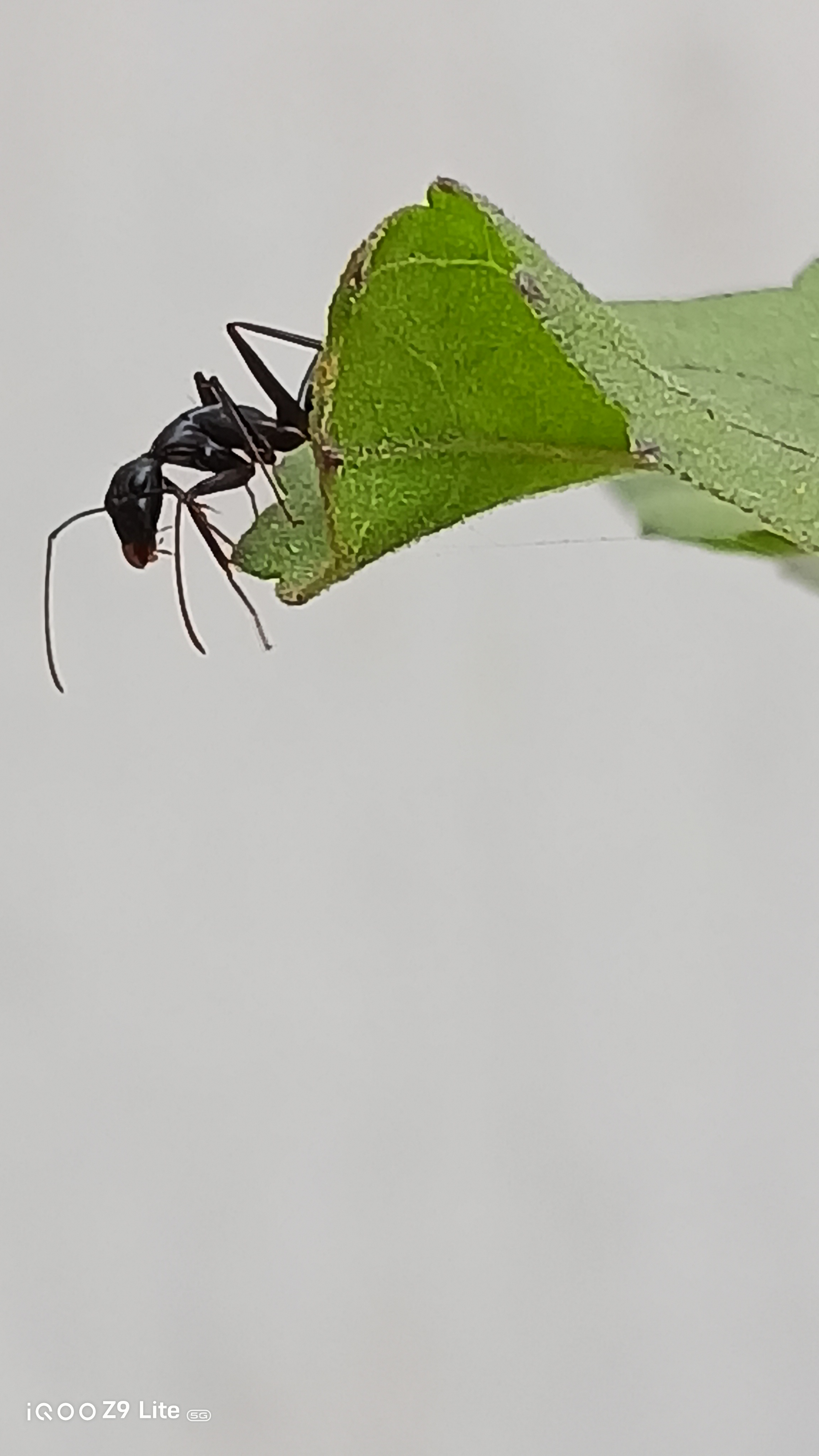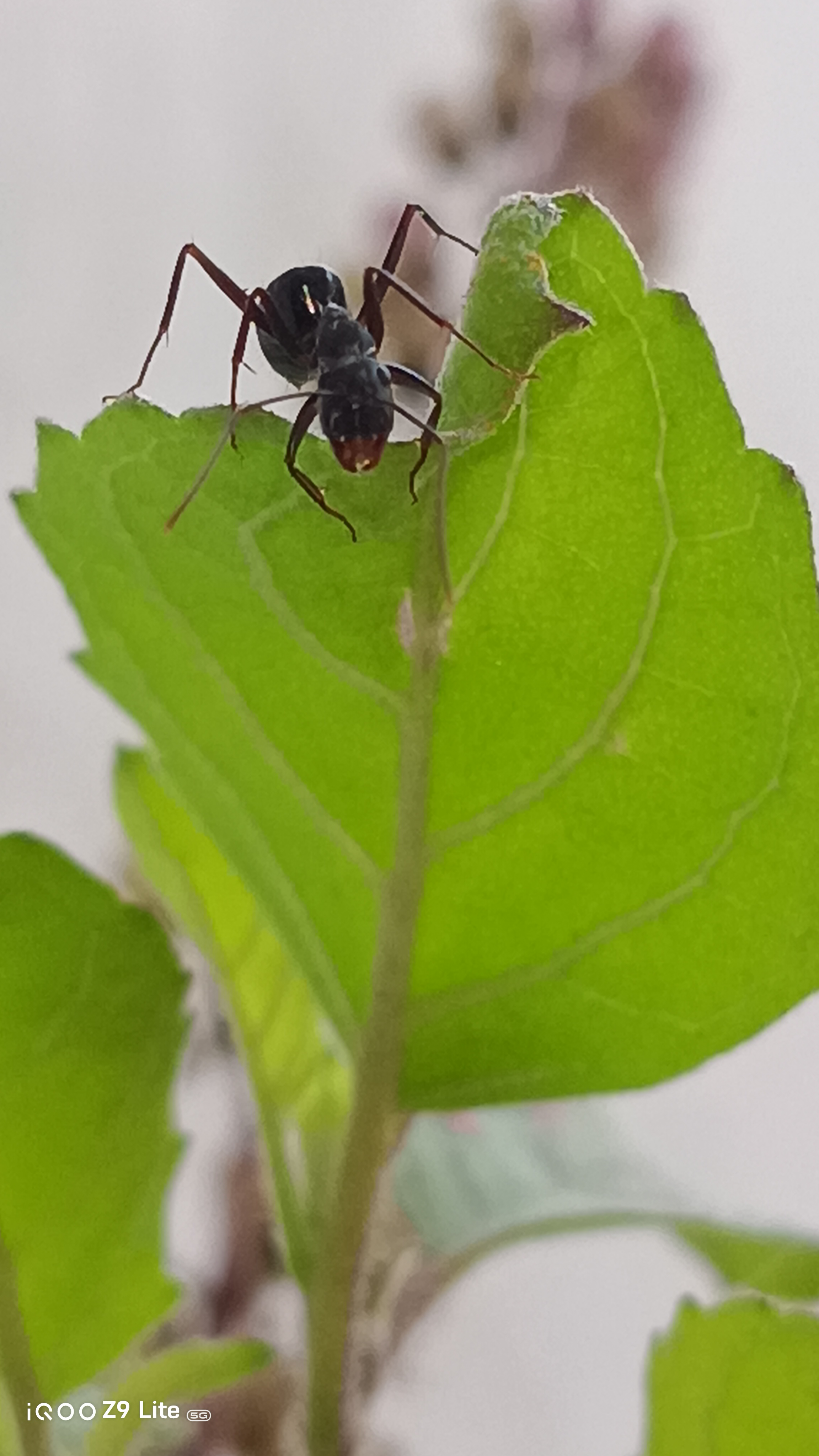 Below is one of the shots taken with the iQOO Z9 Lite, showcasing an ant silhouetted against vibrant green leaves. The photo captures fine details and the natural lighting beautifully, emphasizing the camera's macro capabilities.