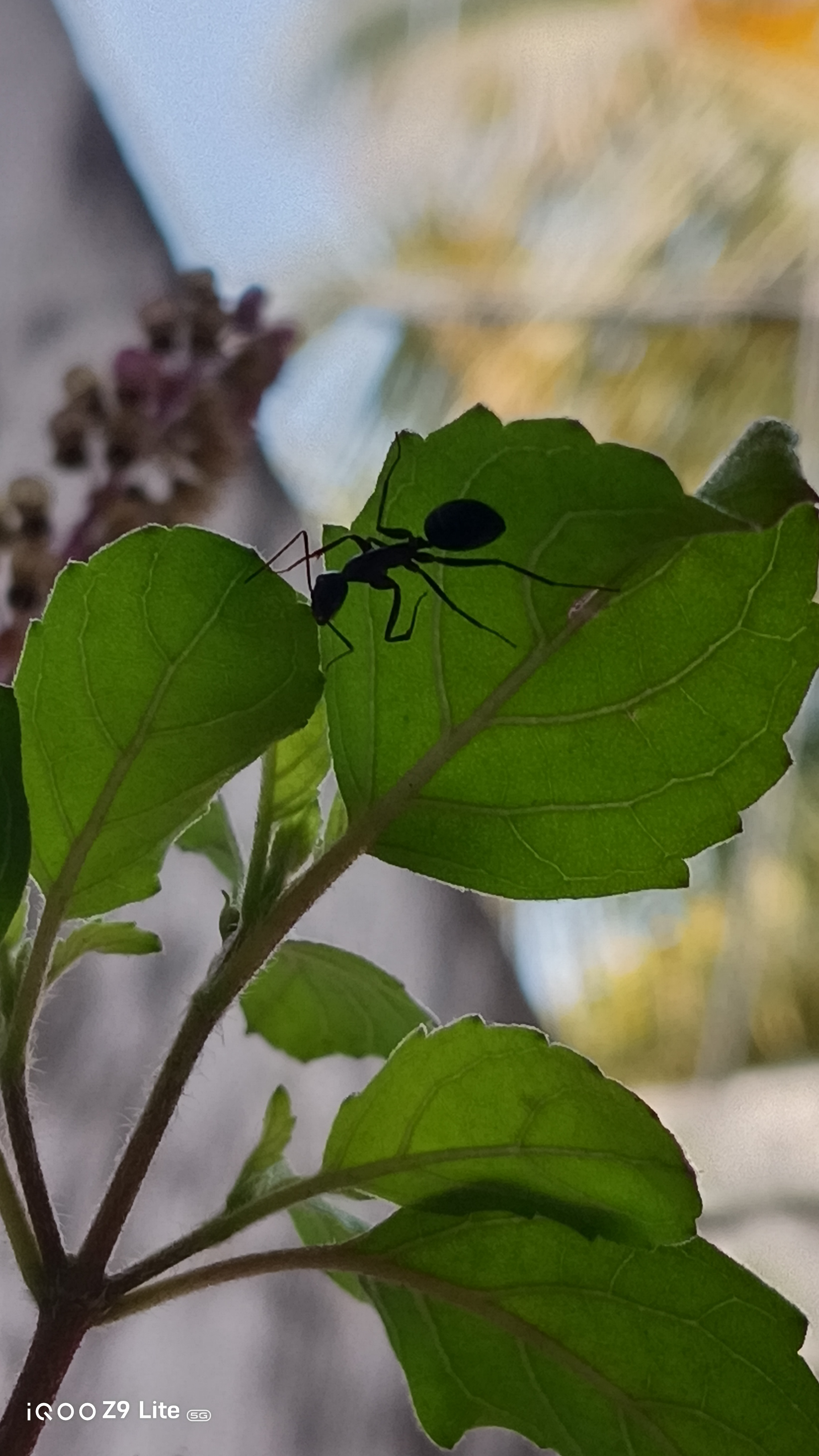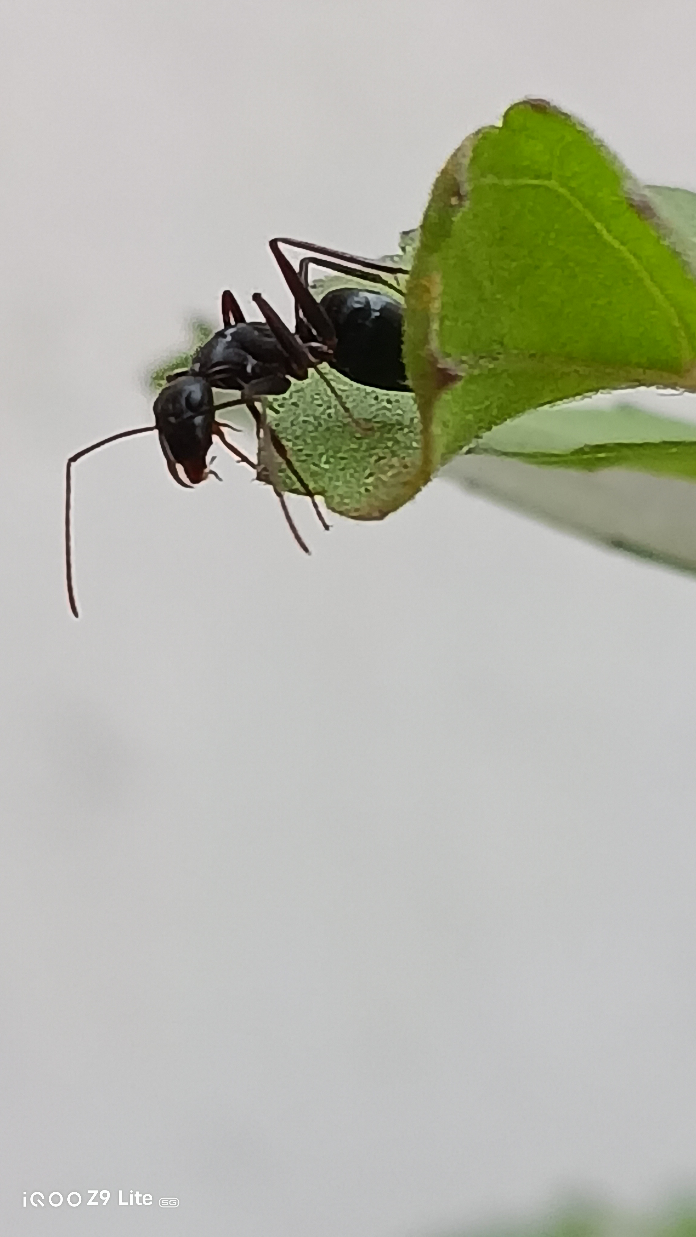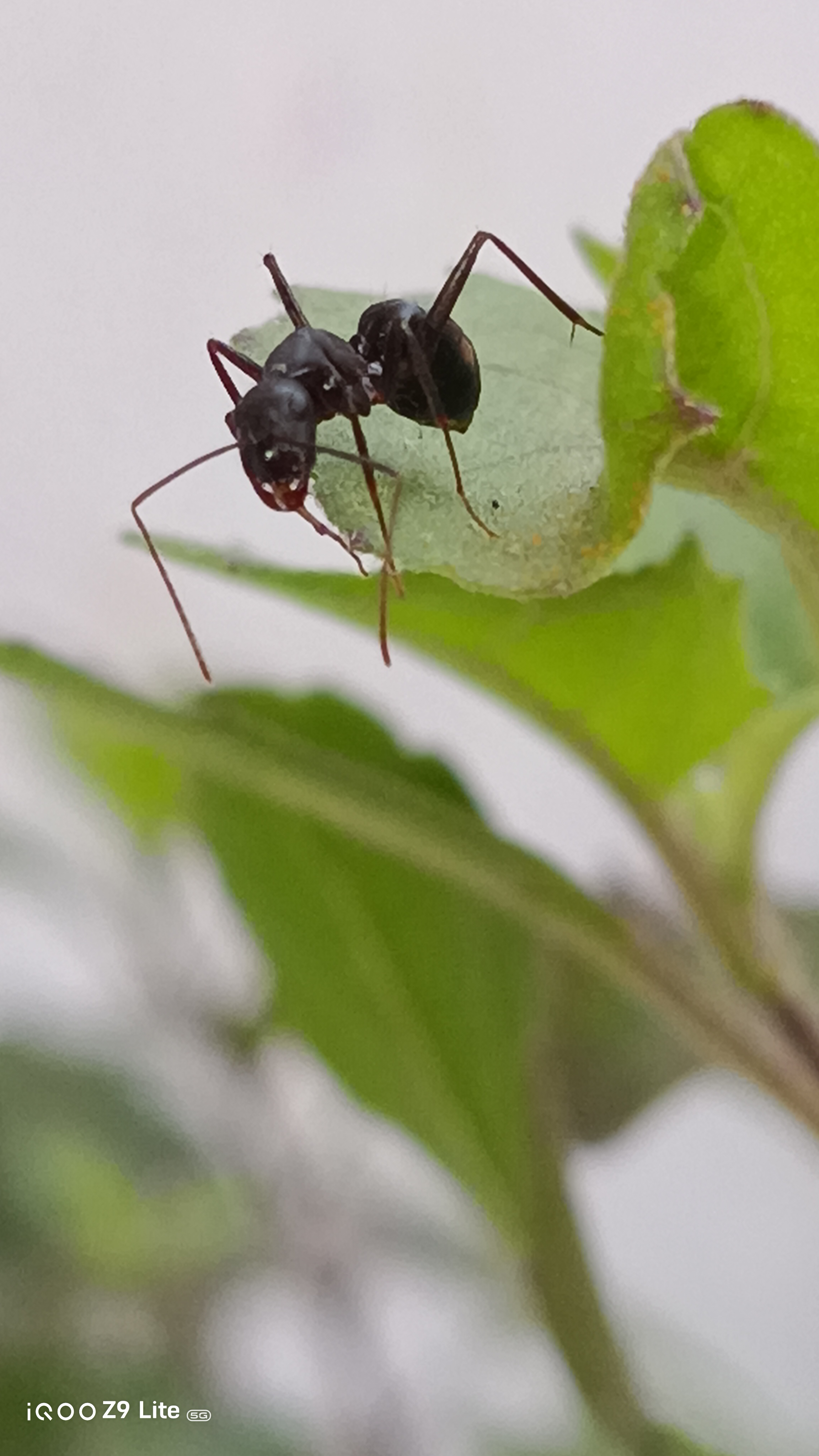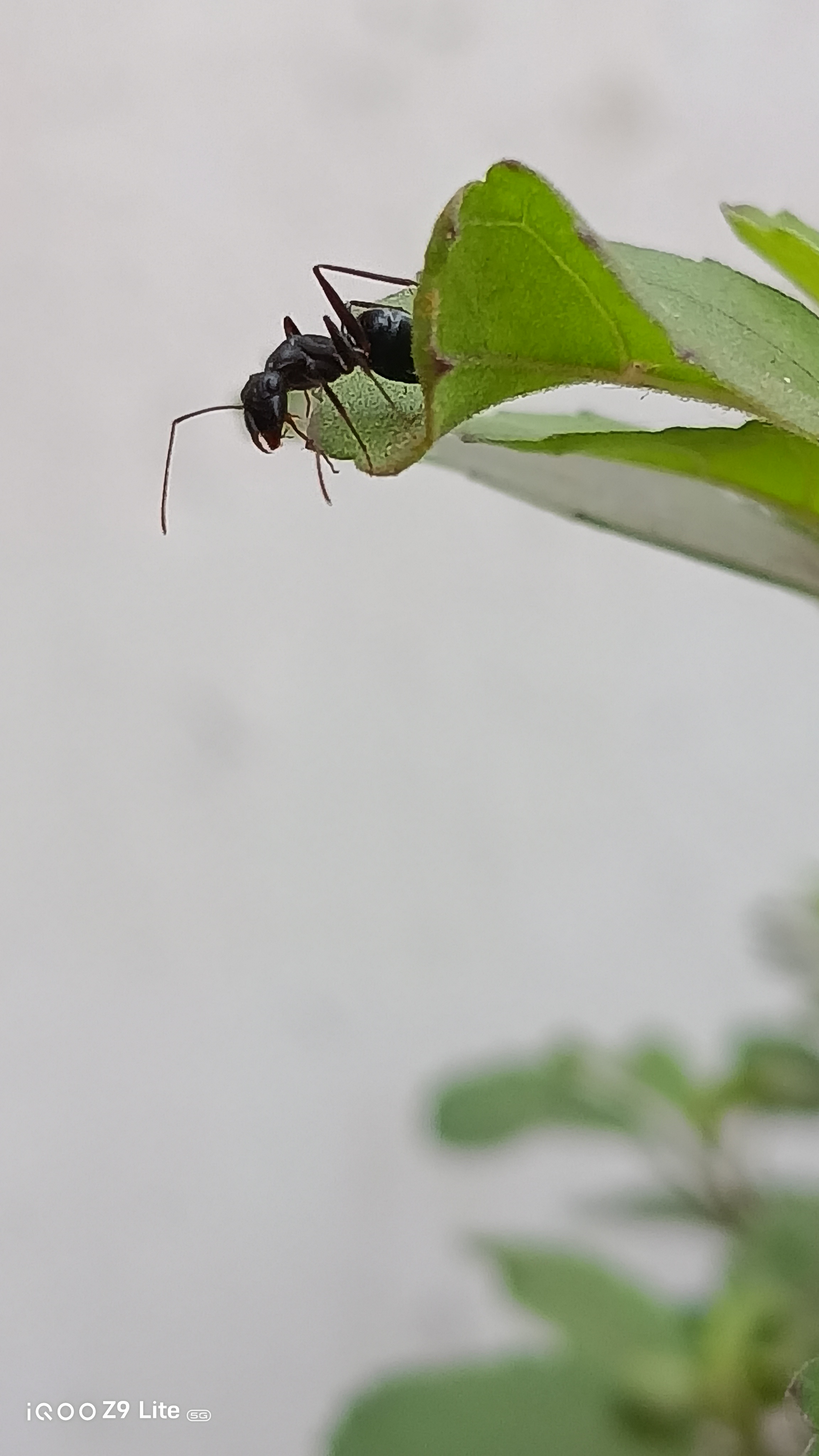 Below is one of the shots taken with the iQOO Z9 Lite, showcasing an ant silhouetted against vibrant green leaves. The photo captures fine details and the natural lighting beautifully, emphasizing the camera's macro capabilities.