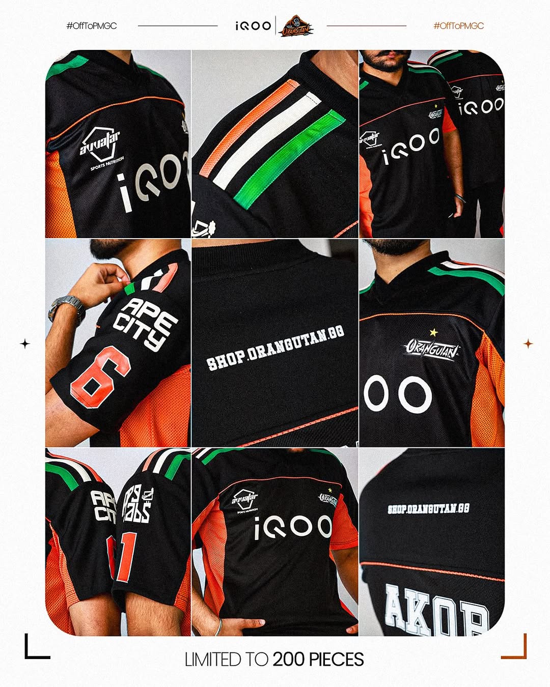 The PMGC kit mirrors the exact outfit worn by Orangutan’s star roster during their international campaign. The design features a deep black base with signature Orangutan orange side panels and subtle green detailing across the shoulders. The iconic iQOO logo sits boldly across the chest, representing the partnership that has powered Orangutan’s competitive journey this season.